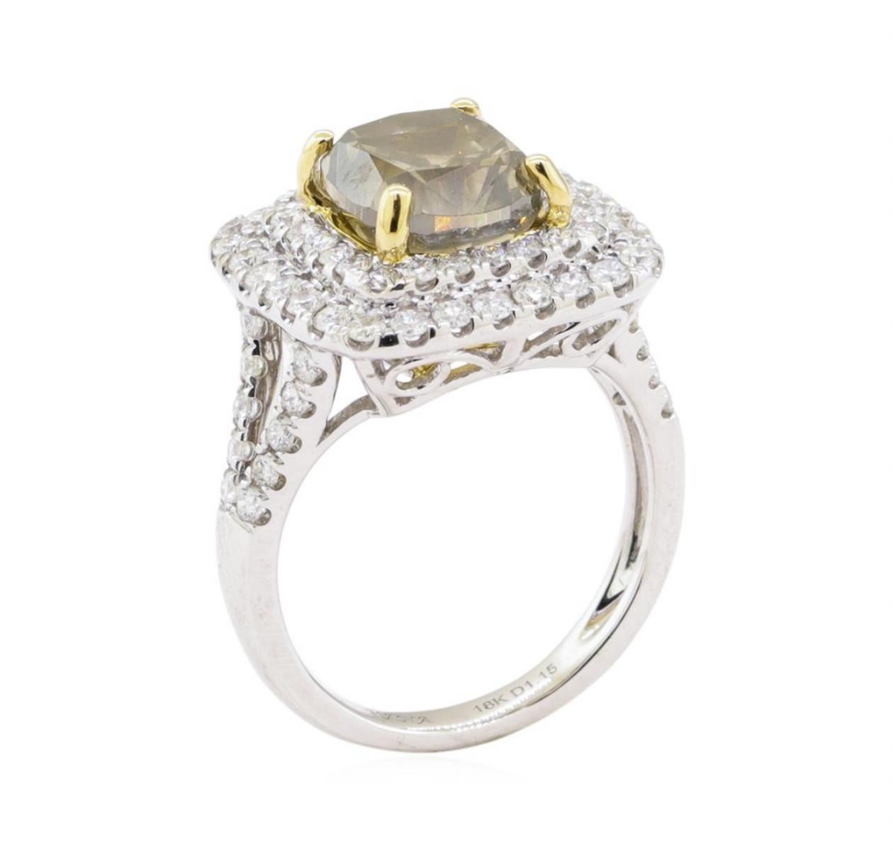 One electronically tested 18KT white gold ladies cast & assembled diamond unity ring. The featured diamond is set within a tiered diamond bezel, supported by an elaborate lattice under gallery and diamond set split shoulders, completed by a two and one half millimeter wide band. Bright polish finish with yellow gold accents. Trademark is HANA. Identified with markings of "18K". Condition is new, good workmanship. Containing: One prong set cushion modified brilliant cut diamond, measuring 9.12 x 8.33 x 6.71mm exact weight 4.49ct. GIA Colored Diamond Report attached. Graded loose for color prior to setting in the GIA Laboratory, Report #6167771182. Clarity graded in the setting. Clarity SI-3 Color Fancy Deep Yellowish Green-Gray Depth 80.55% Table 67.23%. Seventy-Two prong set round brilliant cut diamonds approximate total weight of 72 Stones = 1.15ct. The clarity grade reflects the overall average for the group. Graded in the setting. Clarity SI-2 to I-1 Color F - H Total Weight of Diamonds 5.64 ct. Total Weight of Ring 8.20 gm Estimated Retail Value $ 49,765.00 US