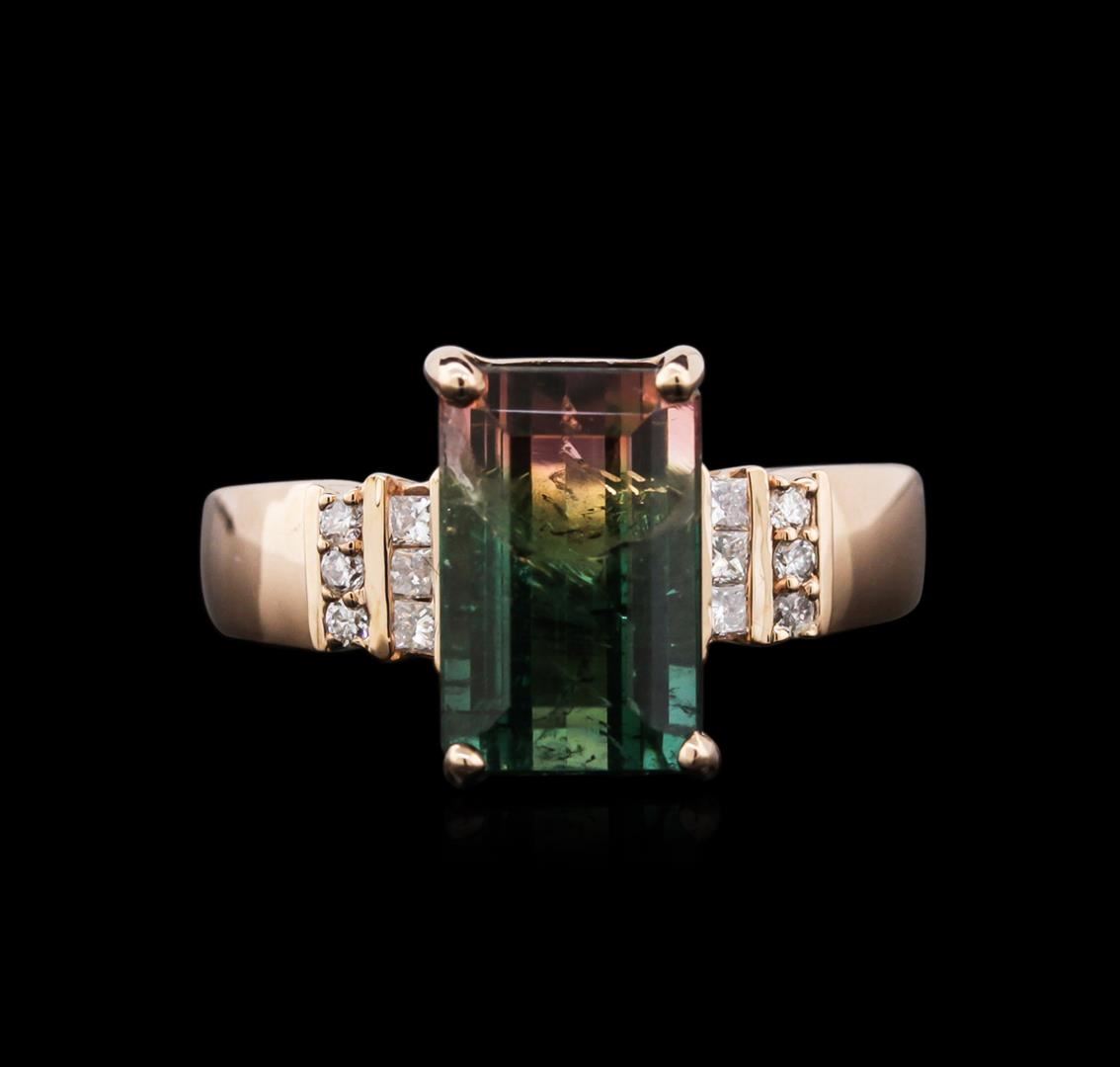 One ring featuring: 14KT rose gold weighing 4.12 grams containing one bi-color tourmaline center stone with a total weight of 4.49ct and six diamonds.