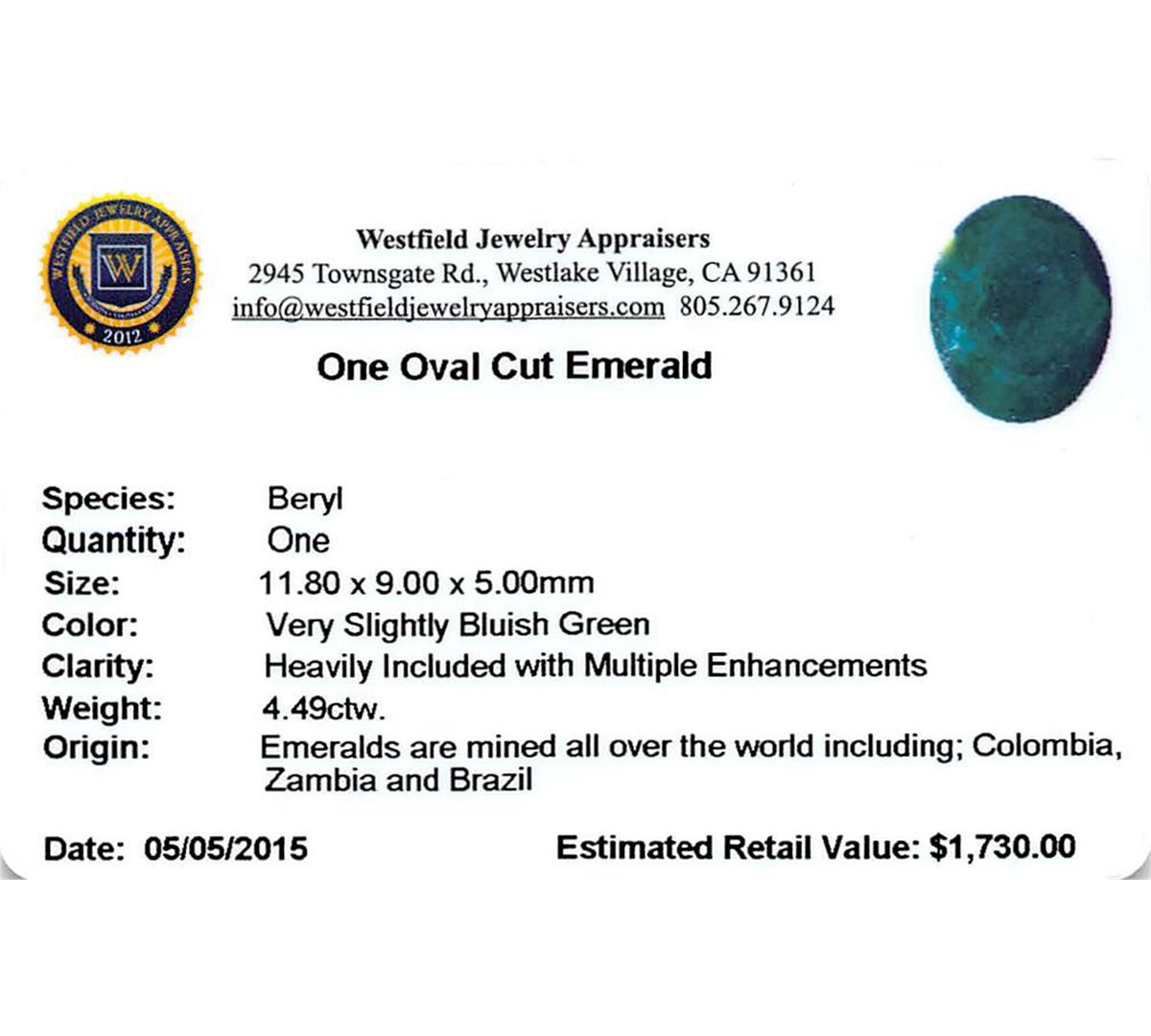 One oval mixed cut natural emerald, measuring 11.80 x 9.00 x 5.00mm, exact weight 4.49ct., clarity is heavily included, medium dark, very slightly grayish, very slightly bluish green color, (GIA vslbG 6/3) Indications of multiple laboratory enhancements, including high temperature heat treatment. Westfield Appraised at $1,730.00.
