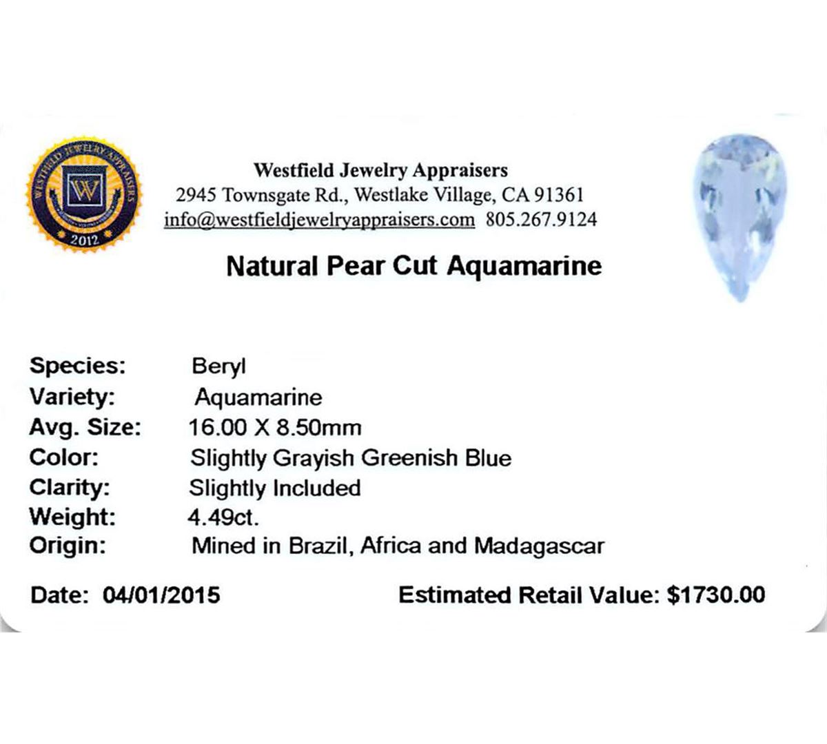 One pear cut natural aquamarine exact weight 4.49ct., clarity is slightly included, type I, medium, very slightly grayish, very slightly greenish blue color, (GIA vslgB 5/3), cut is good. Westfield Appraised at $1,730.00.