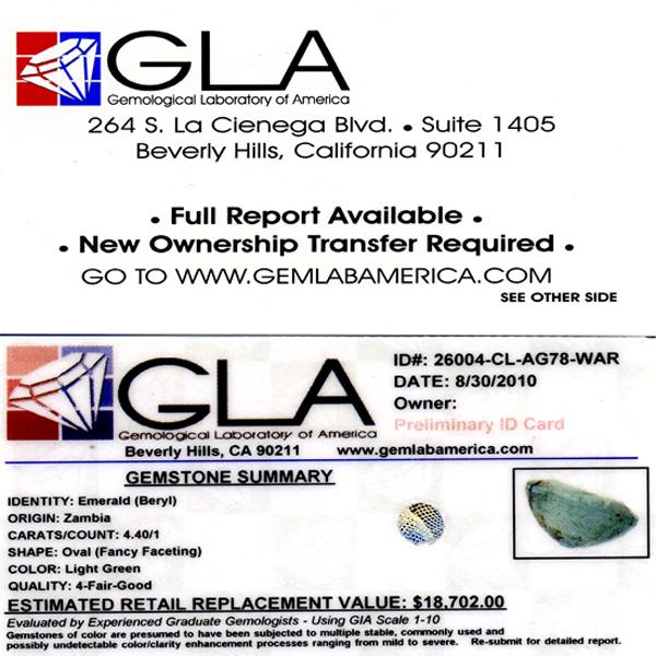 Excellent light green colored specimen oval cut; lab quality evaluation 4; treatment as noted; Gem Guide wholesale $2200-$3300; full retail appraisal $18702; full lab evaluation available