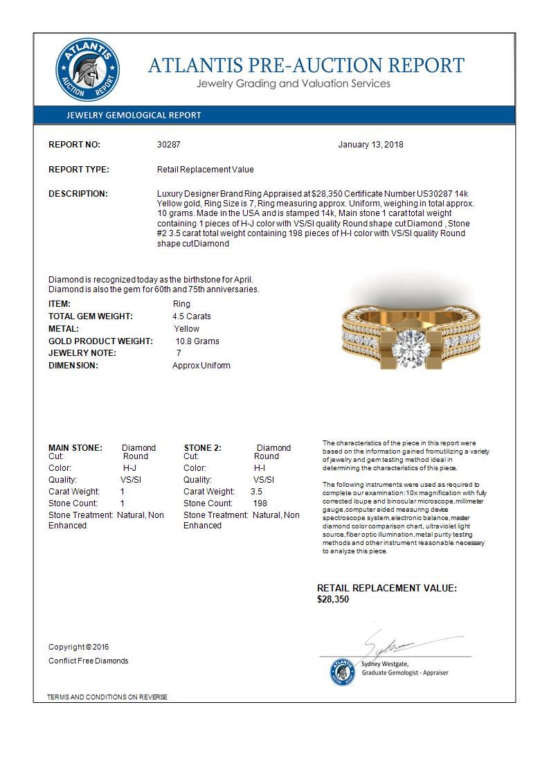 REF-572W4F -30287 ---- 4.5 CTW Certified VS/SI Diamond Art Deco Micro Ring 14K Yellow Gold ---- Luxury Designer Brand Ring Appraised at $28,350 Certificate Number US30287 14k Yellow gold, Ring Size is 7, Ring measuring approx. Uniform, weighing in total approx. 10 grams. Made in the USA and is stamped 14k, Main stone 1 carat total weight containing 1 pieces of H-J color with VS/SI quality Round shape cut Diamond , Stone #2 3.5 carat total weight containing 198 pieces of H-I color with VS/SI quality Round shape cut Diamond