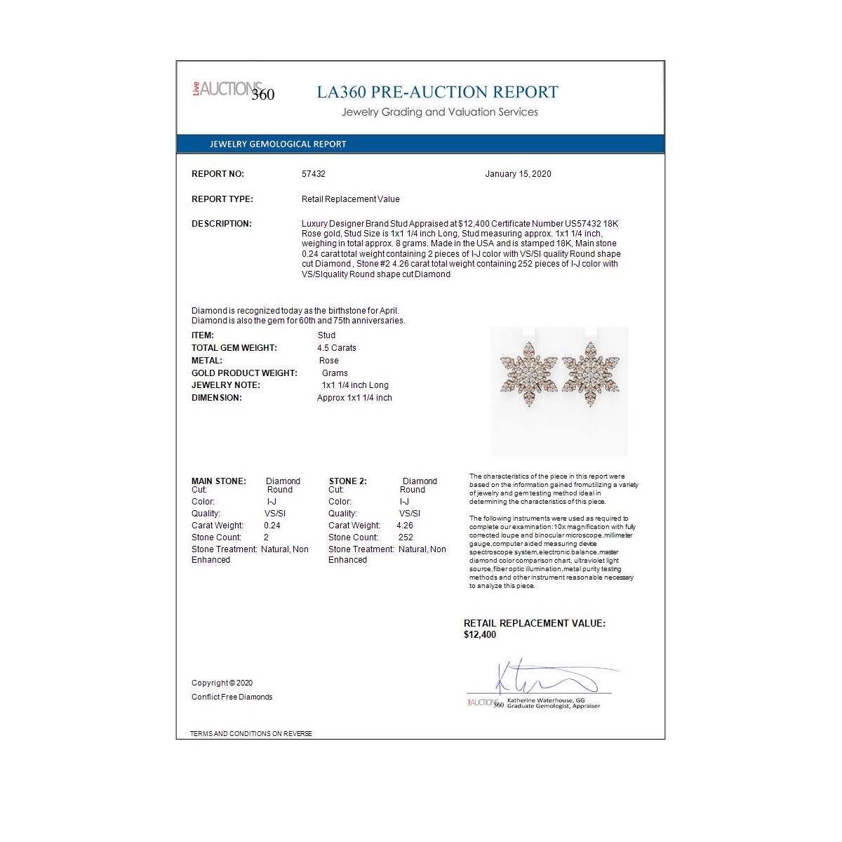 All sales are final, placing a bid is a legally binding obligation. All lots are sold as is, where is, with all the faults, imperfections, omissions and errors in the written description, estimates, appraisals, graphics and photography. USJL is not responsible for any errors or omissions in the description, graphics or photography provided or in the bidding software. Due diligence to verify the condition and description of a lot is the sole responsibility of the Bidder prior to placing any bid. Returns may only be made with the advance written authorization of USJL and are in USJL's sole discretion to approve. To request a return you must provide a written request fully explaining the basis for the return no later than 4 days after your receipt of the lot. Under no circumstances will any amounts other than the winning bid amount be refunded. A restocking charge of 19% of the full invoice amount may apply in USJL 's sole discretion. Any allowed returns must be received in exactly the same condition as when originally shipped to Buyer, or they will be returned to buyer at Buyer's cost. Any unauthorized returns will be refused. DELIVERY REFUSAL OF ITEMS SHIPPED BY US JEWELRY LIQUIDATION TO THE BIDDER CONSTITUTES AN UNAUTHORIZED RETURN IN DIRECT VIOLATION OF THESE GENERAL TERMS AND CONDITIONS.