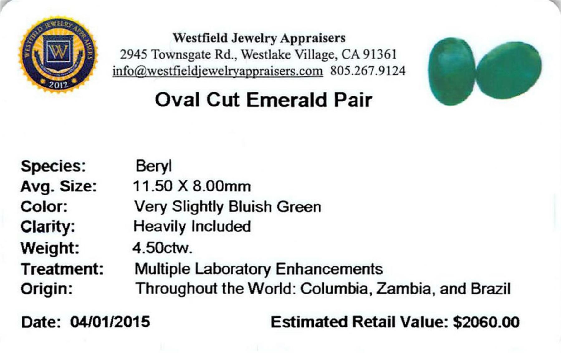 Two oval cut natural emeralds, measuring 11.75 x 8.00 x 3.18mm, exact total weight 4.50 ct., clarity is heavily included, type III, medium dark, very slightly grayish, very slightly bluish green color, (GIA vslbG 6/3), cut is good. Indications of multiple laboratory enhancements, including high temperature heat treatment. Westfield Appraised.