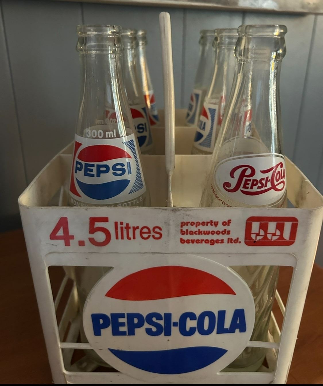 4.5 litre Pepsi bottle plastic carrier with 6 300 ml vintage bottles