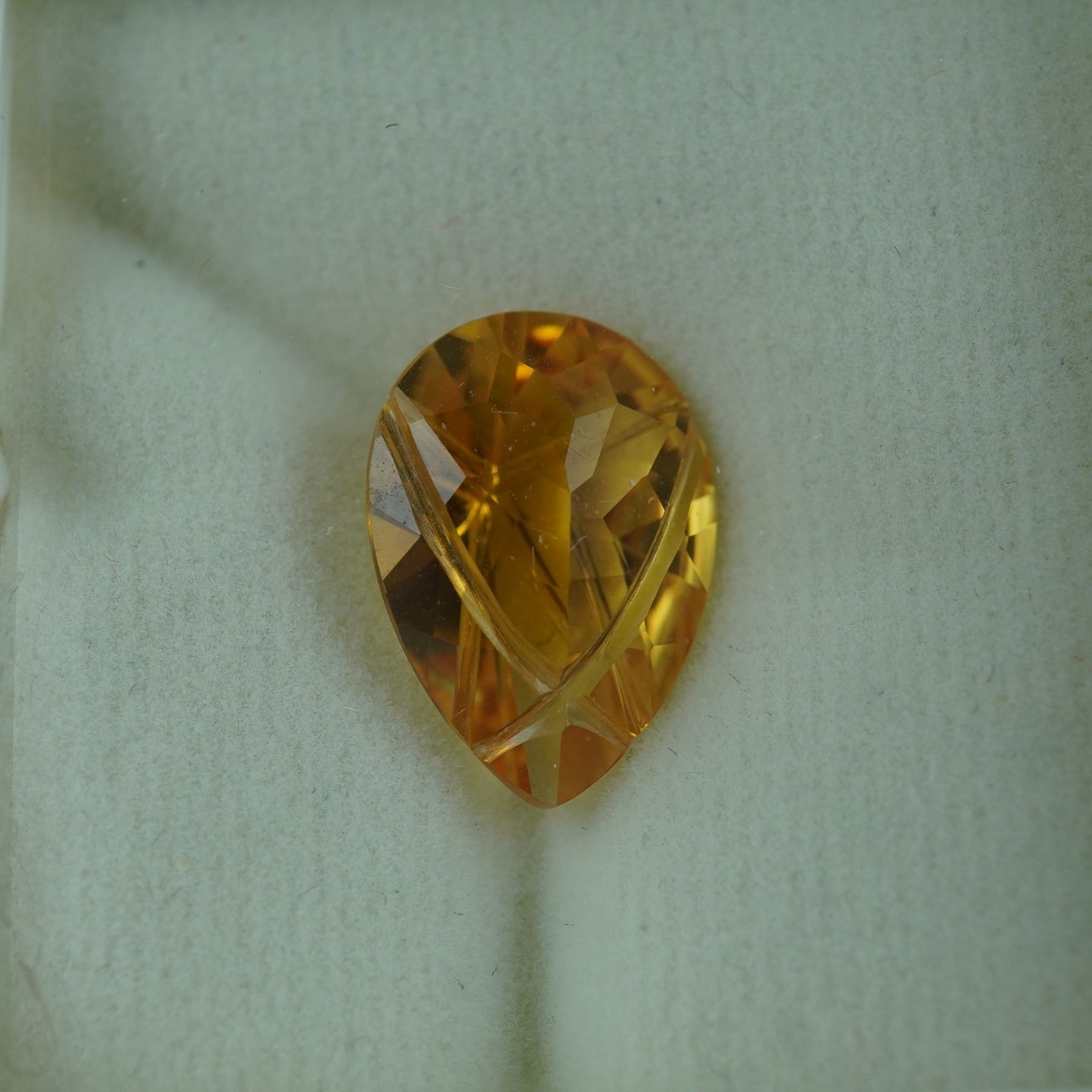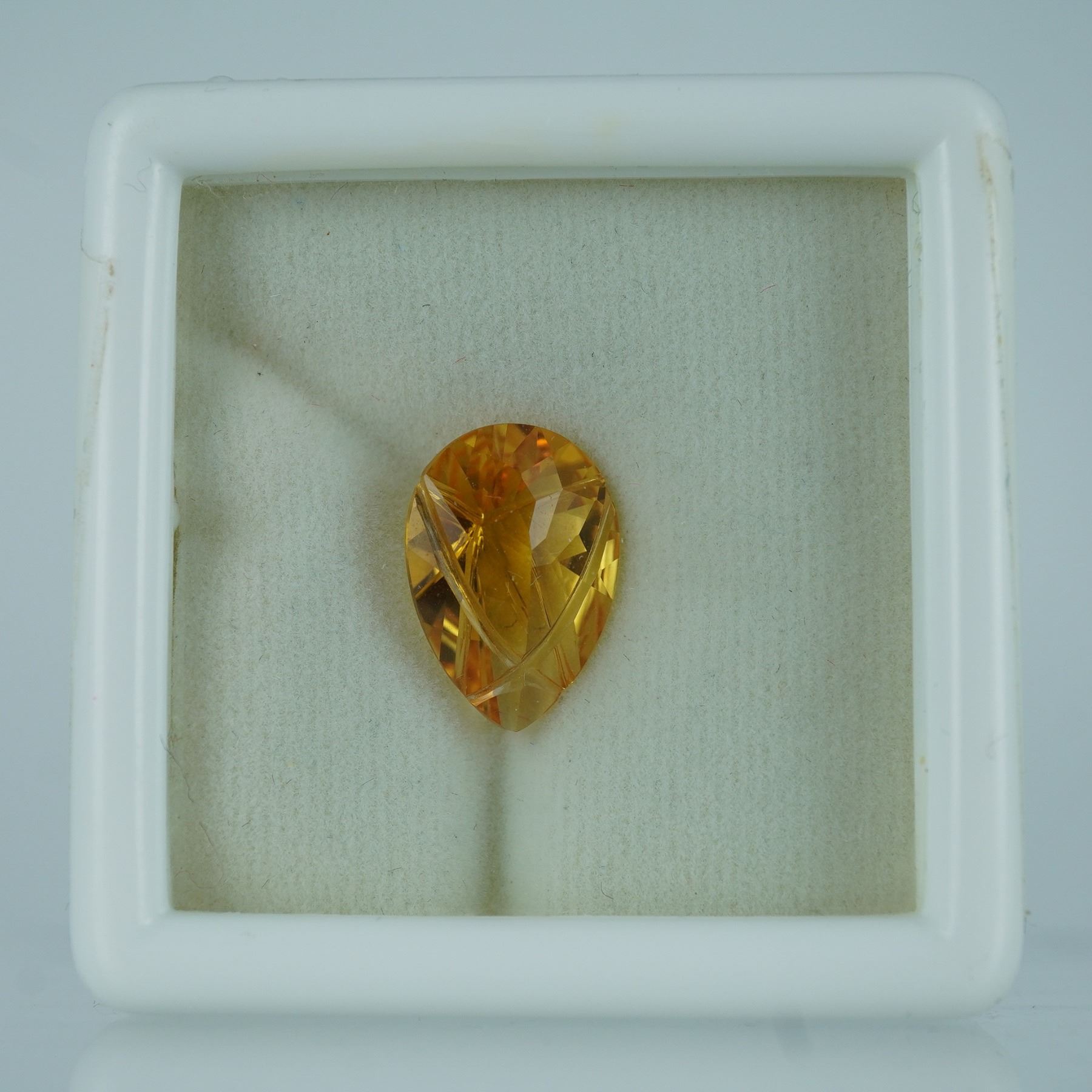 This vibrant 4.50-carat citrine gemstone features a striking pear cut with a stunning golden yellow hue. Laser cut for precision, it showcases clarity and color that will make a bold statement in any jewelry design. Comes with a protective case.