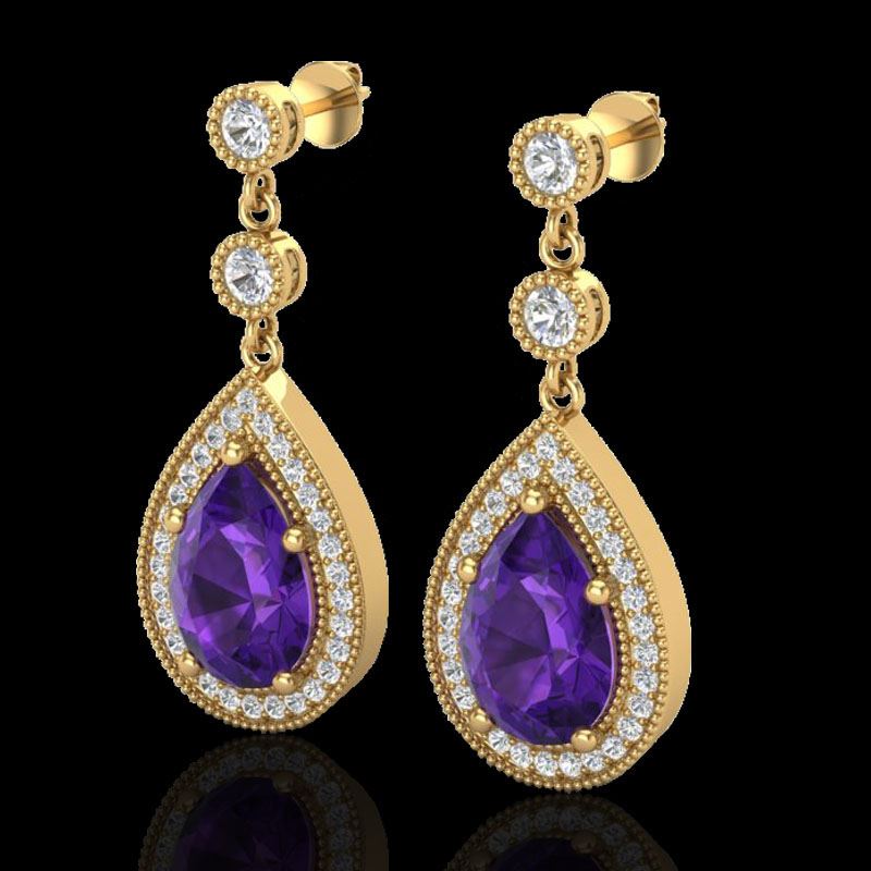REF-67X5T -23111 ---- 4.50 CTW Amethyst & Micro Pave VS/SI Diamond Earrings 18K Yellow Gold ---- Luxury Designer Brand Earring Appraised at $4,800 Certificate Number US23111 18k Yellow gold, Earring Size is 3/8 Inches, Earring measuring approx. 3/8" x 3/4" , weighing in total approx. 3.8 grams. Made in the USA and is stamped 18k, Main stone 3.98 carat total weight containing 2 pieces of Intense Translucent Purple color with AAA quality Pear shape cut Amethyst , Stone #2 0.52 carat total weight containing 50 pieces of H-I color with VS/SI quality Round shape cut Diamond
