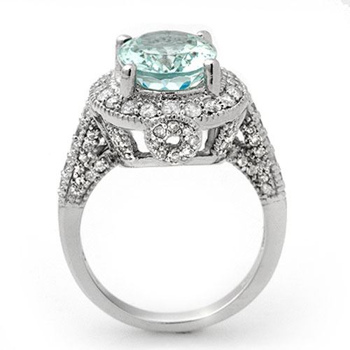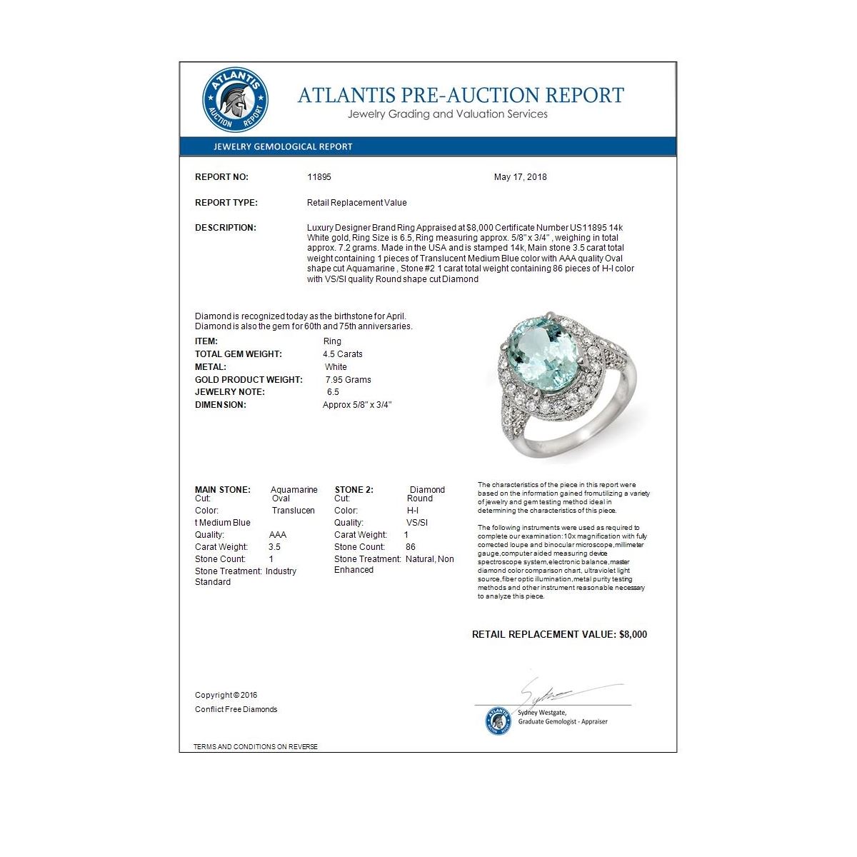 REF-111W6F -11895 ---- 4.50 CTW Aquamarine & Diamond Ring 14K White Gold ---- Luxury Designer Brand Ring Appraised at $8,000 Certificate Number US11895 14k White gold, Ring Size is 6.5, Ring measuring approx. 5/8" x 3/4" , weighing in total approx. 7.2 grams. Made in the USA and is stamped 14k, Main stone 3.5 carat total weight containing 1 pieces of Translucent Medium Blue color with AAA quality Oval shape cut Aquamarine , Stone #2 1 carat total weight containing 86 pieces of H-I color with VS/SI quality Round shape cut Diamond