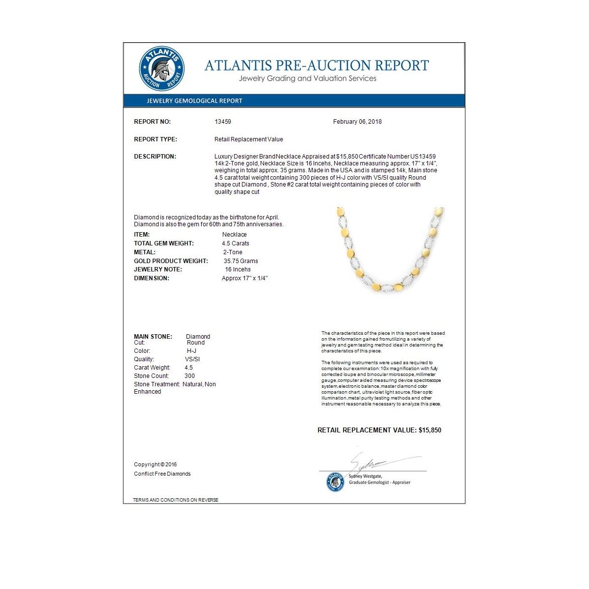 REF-339W8F -13459 ---- 4.50 CTW Certified VS/SI Diamond Necklace 14K 2-Tone Gold ---- Luxury Designer Brand Necklace Appraised at $15,850 Certificate Number US13459 14k 2-Tone gold, Necklace Size is 16 Incehs, Necklace measuring approx. 17" x 1/4", weighing in total approx. 35 grams. Made in the USA and is stamped 14k, Main stone 4.5 carat total weight containing 300 pieces of H-J color with VS/SI quality Round shape cut Diamond , Stone #2 carat total weight containing pieces of color with quality shape cut