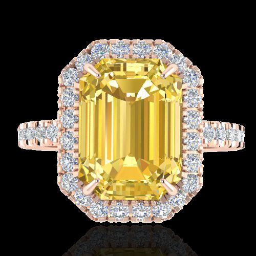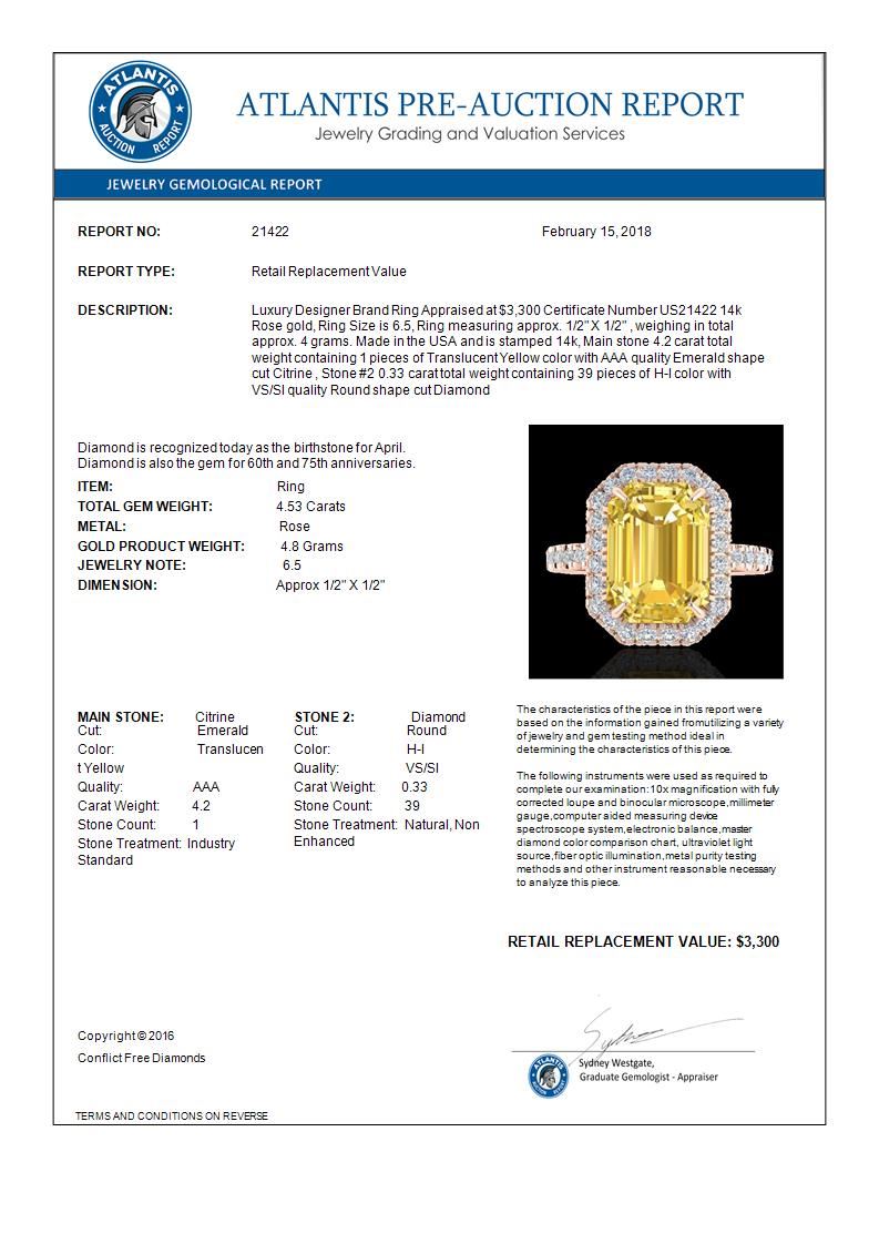 REF-49W8F -21422 ---- 4.50 CTW Citrine And Micro Pave VS/SI Diamond Halo Ring 14K Rose Gold ---- Luxury Designer Brand Ring Appraised at $3,300 Certificate Number US21422 14k Rose gold, Ring Size is 6.5, Ring measuring approx. 1/2" X 1/2" , weighing in total approx. 4 grams. Made in the USA and is stamped 14k, Main stone 4.2 carat total weight containing 1 pieces of Translucent Yellow color with AAA quality Emerald shape cut Citrine , Stone #2 0.33 carat total weight containing 39 pieces of H-I color with VS/SI quality Round shape cut Diamond