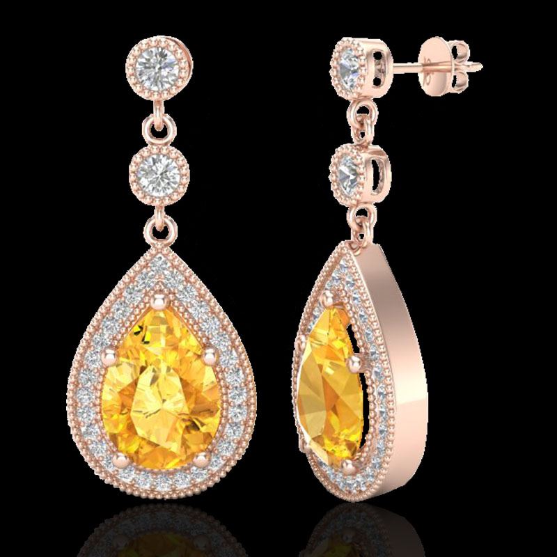 REF-61H8A -23113 ---- 4.50 CTW Citrine & Micro VS/SI Diamond Earrings Designer 14K Rose Gold ---- Luxury Designer Brand Earring Appraised at $4,100 Certificate Number US23113 14k Rose gold, Earring Size is 3/8 Inches, Earring measuring approx. 3/8" x 3/4" , weighing in total approx. 3.8 grams. Made in the USA and is stamped 14k, Main stone 3.98 carat total weight containing 2 pieces of Translucent Yellow color with AAA quality Pear shape cut Citrine , Stone #2 0.52 carat total weight containing 50 pieces of H-I color with VS/SI quality Round shape cut Diamond