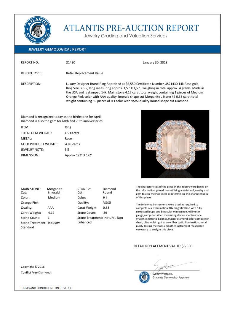 REF-91W6F -21430 ---- 4.50 CTW Morganite & Micro Pave VS/SI Diamond Halo Ring 14K Rose Gold ---- Luxury Designer Brand Ring Appraised at $6,550 Certificate Number US21430 14k Rose gold, Ring Size is 6.5, Ring measuring approx. 1/2" X 1/2" , weighing in total approx. 4 grams. Made in the USA and is stamped 14k, Main stone 4.17 carat total weight containing 1 pieces of Medium Orange Pink color with AAA quality Emerald shape cut Morganite , Stone #2 0.33 carat total weight containing 39 pieces of H-I color with VS/SI quality Round shape cut Diamond
