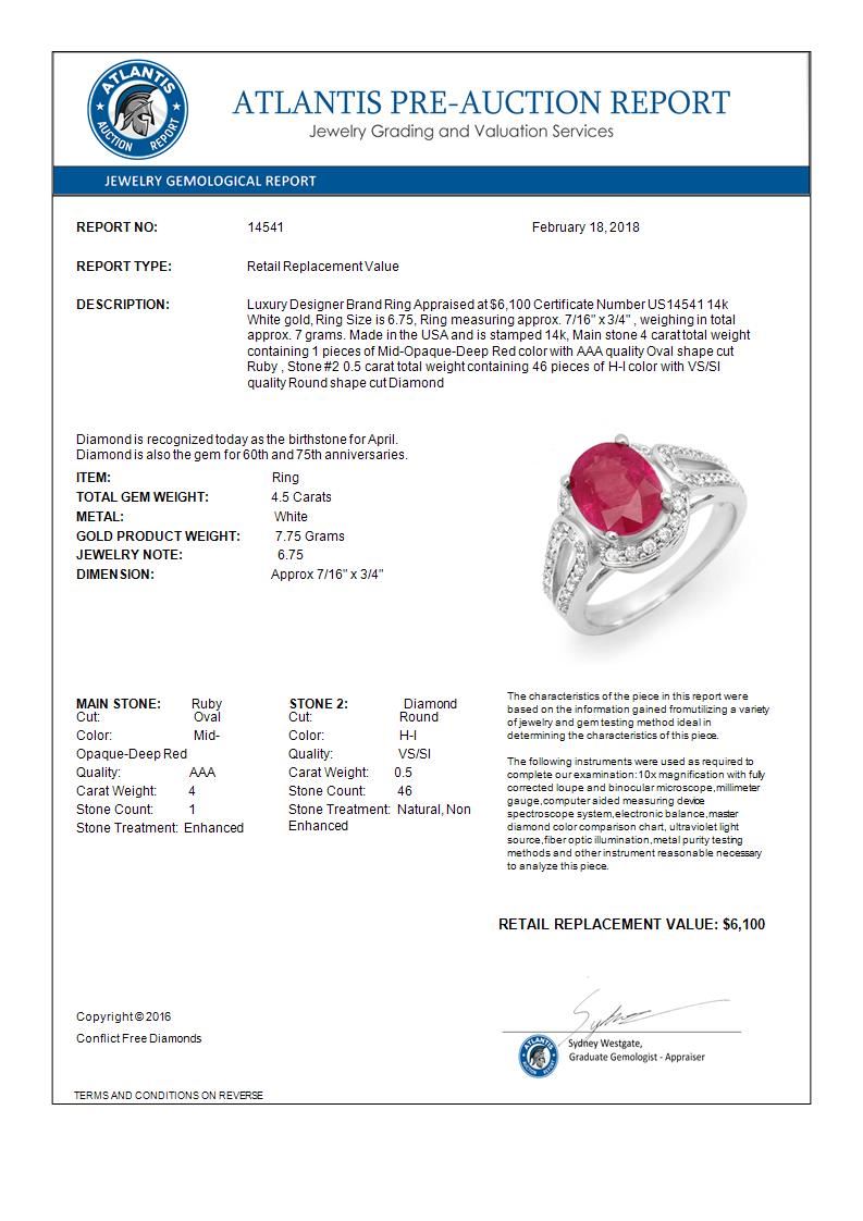 REF-85H5A -14541 ---- 4.50 CTW Ruby & Diamond Ring 14K White Gold ---- Luxury Designer Brand Ring Appraised at $6,100 Certificate Number US14541 14k White gold, Ring Size is 6.75, Ring measuring approx. 7/16" x 3/4" , weighing in total approx. 7 grams. Made in the USA and is stamped 14k, Main stone 4 carat total weight containing 1 pieces of Mid-Opaque-Deep Red color with AAA quality Oval shape cut Ruby , Stone #2 0.5 carat total weight containing 46 pieces of H-I color with VS/SI quality Round shape cut Diamond