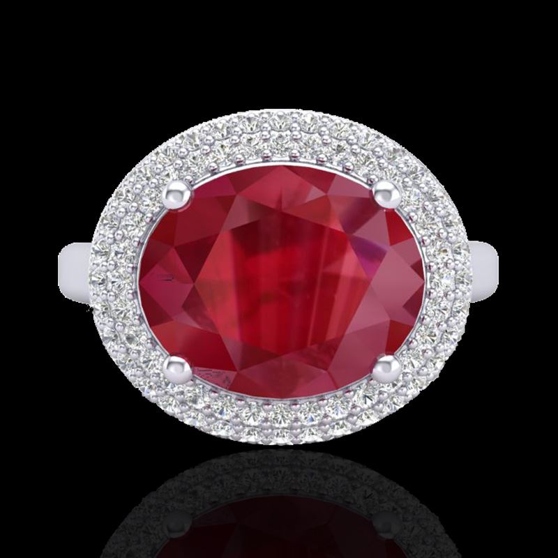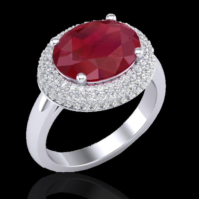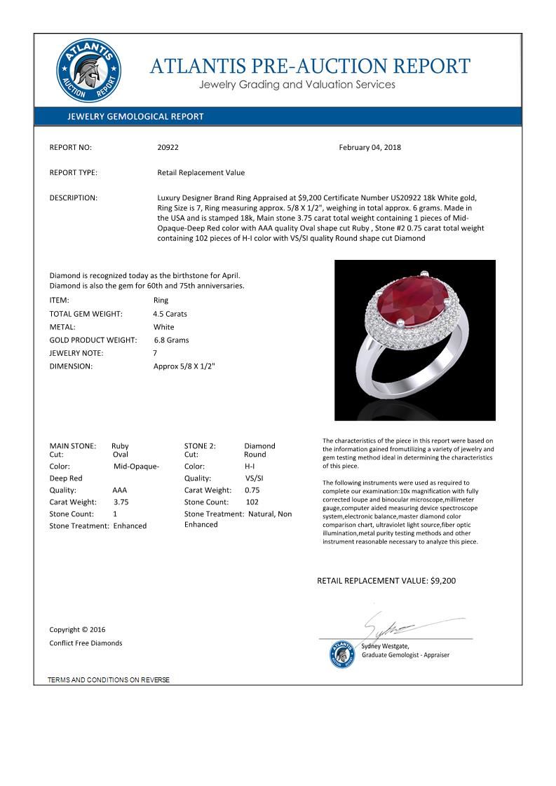 REF-119T6M -20922 ---- 4.50 CTW Ruby & Micro Pave VS/SI Diamond Ring 18K White Gold ---- Luxury Designer Brand Ring Appraised at $9,200 Certificate Number US20922 18k White gold, Ring Size is 7, Ring measuring approx. 5/8 X 1/2", weighing in total approx. 6 grams. Made in the USA and is stamped 18k, Main stone 3.75 carat total weight containing 1 pieces of Mid-Opaque-Deep Red color with AAA quality Oval shape cut Ruby , Stone #2 0.75 carat total weight containing 102 pieces of H-I color with VS/SI quality Round shape cut Diamond