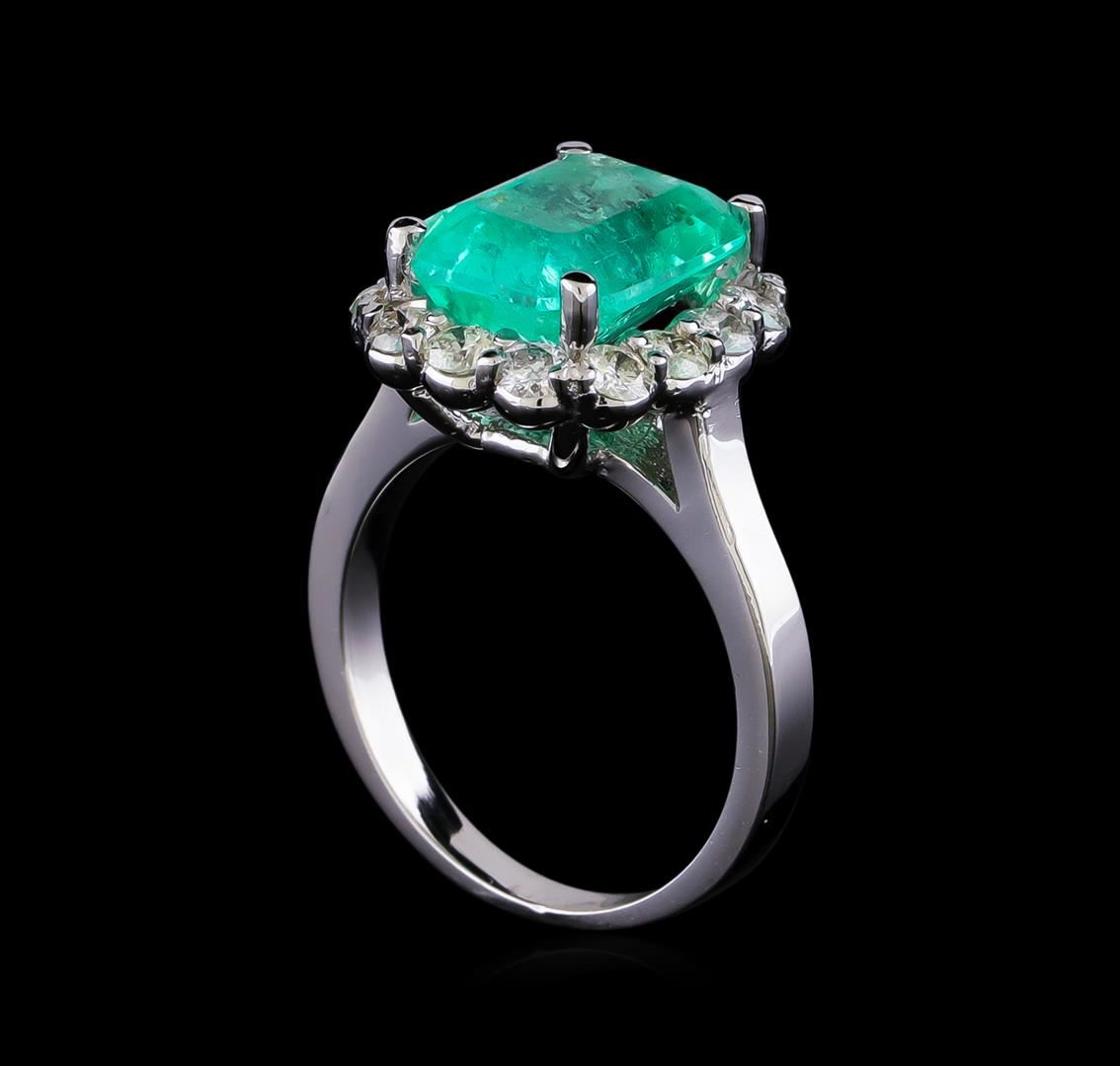 One electronically tested 14KT white gold lady's cast fashion ring with a cathedral basket halo with a bright polish finish. The featured lady's ring has a shank measuring 2.31 millimeters in width. Identified with markings of "14K". Condition is new, good workmanship. Containing: One prong set emerald step cut natural emerald, measuring 11.39 x 9.11 x 6.63mm, (depth est.) approximate weight of 4.50ct., clarity is heavily included, medium light, moderately strong, green color, (GIA G 4/4), cut is very good. Transmitting light somewhat diffusely, transparent to translucent. Colored gemstones are presumed to have been subjected to commonly used enhancement processes. Indications of oil residue. Graded in the setting. Fourteen prong set round brilliant cut diamonds, measuring 2.60 - 2.50 x 1.60mm (depth est.) approximate total weight of 14 Stones = 0.90ct. Graded in the setting. Clarity: SI-1 to SI-2. Color: H - I. Cut Good. Total Weight of Colored Stones 4.50ct. Total Weight of Diamonds 0.90ct. Total Weight of Ring 6.20gm. GAS Appraised at $8,890.00.