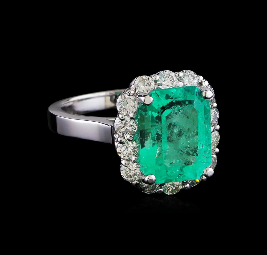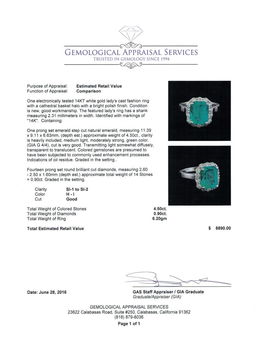 One electronically tested 14KT white gold lady's cast fashion ring with a cathedral basket halo with a bright polish finish. The featured lady's ring has a shank measuring 2.31 millimeters in width. Identified with markings of "14K". Condition is new, good workmanship. Containing: One prong set emerald step cut natural emerald, measuring 11.39 x 9.11 x 6.63mm, (depth est.) approximate weight of 4.50ct., clarity is heavily included, medium light, moderately strong, green color, (GIA G 4/4), cut is very good. Transmitting light somewhat diffusely, transparent to translucent. Colored gemstones are presumed to have been subjected to commonly used enhancement processes. Indications of oil residue. Graded in the setting. Fourteen prong set round brilliant cut diamonds, measuring 2.60 - 2.50 x 1.60mm (depth est.) approximate total weight of 14 Stones = 0.90ct. Graded in the setting. Clarity: SI-1 to SI-2. Color: H - I. Cut Good. Total Weight of Colored Stones 4.50ct. Total Weight of Diamonds 0.90ct. Total Weight of Ring 6.20gm. GAS Appraised at $8,890.00.