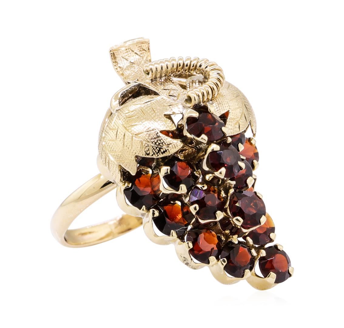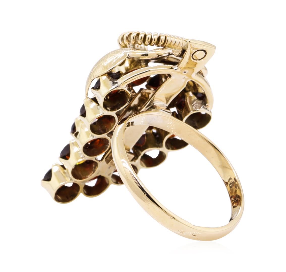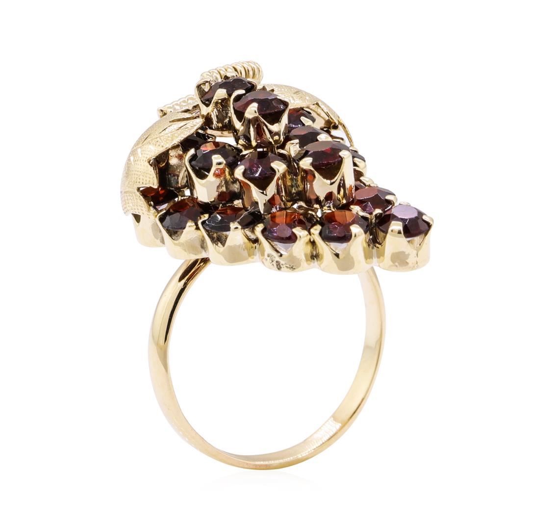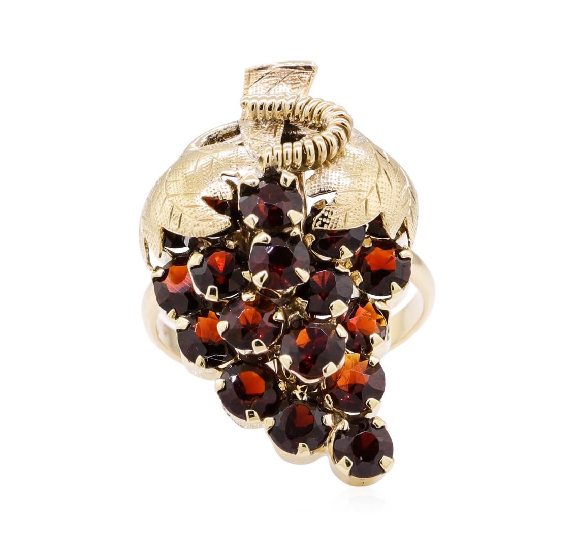 One ring featuring: 14KT yellow gold weighing 6.0 grams containing round cut garnets weighing 4.50ctw. The ring has a grape cluster motif.