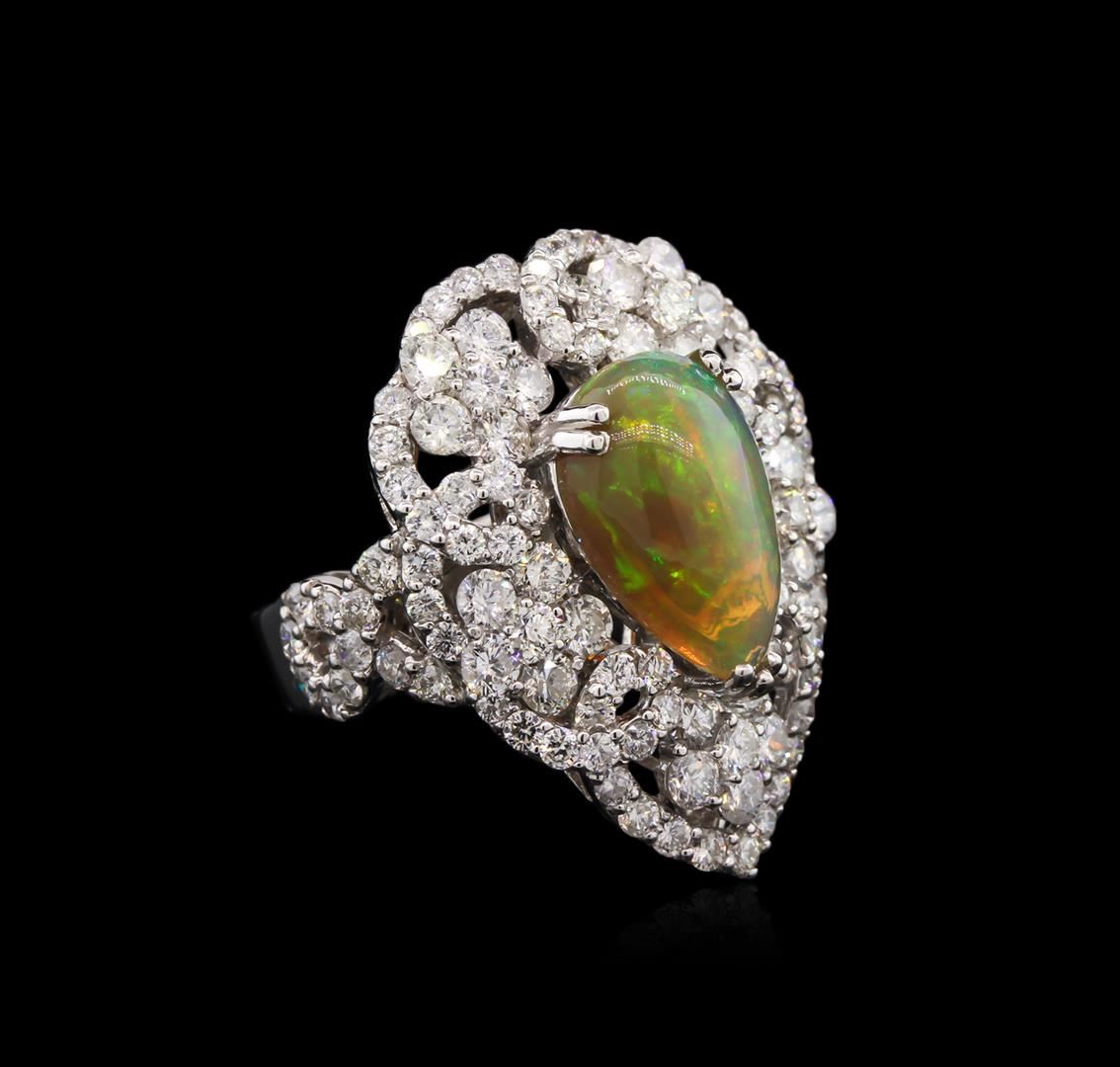 One electronically tested 18KT white gold lady's cast fashion ring with a split shank with a bright polish finish. The featured lady's ring has scalloped halo motif and a shank measuring 3.81 millimeters wide. Identified with markings of "18K 750". Condition is new, good workmanship. Containing: One jelly opal that is cut in a pear shaped cabochon and is prong set, measuring 14.30 mm long x 9.55 mm wide, and 4.80 mm thick and the approximate weight is 4.50 carats. The opal has a bright, blue-green play of color (fire) in a rolling flashfire pattern; a medium dome; a good cut; ; slight variation in base in its brightness and pattern; and is very directional. Graded in the setting. Thirty prong set round brilliant cut diamonds, measuring 2.80 - 2.50 x 1.59mm (depth est.) approximate total weight of 30 Stones = 2.05ct. Graded in the setting. Clarity: SI-2 to I-1. Color: G - I. Cut Good Ninety prong set round brilliant cut diamonds, measuring 1.90 - 1.65 x 1.10mm (depth est.) approximate total weight of 90 Stones = 1.90ct. Graded in the setting. Clarity: SI-2 to I-1. Color: G - I. Cut Good. Total Weight of Diamonds 3.95ct. Total Weight of Opals 4.50ct. Total Weight of Ring 10.20gm. GAS Appraised at $11,050.00.