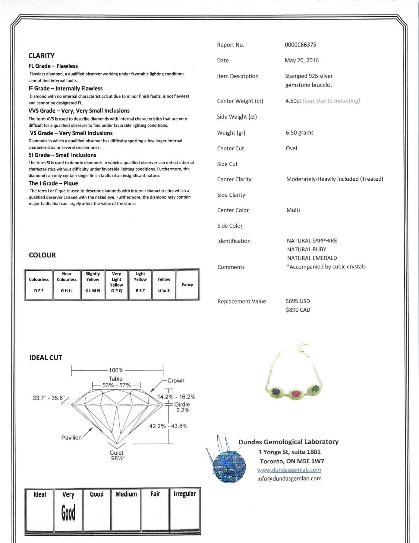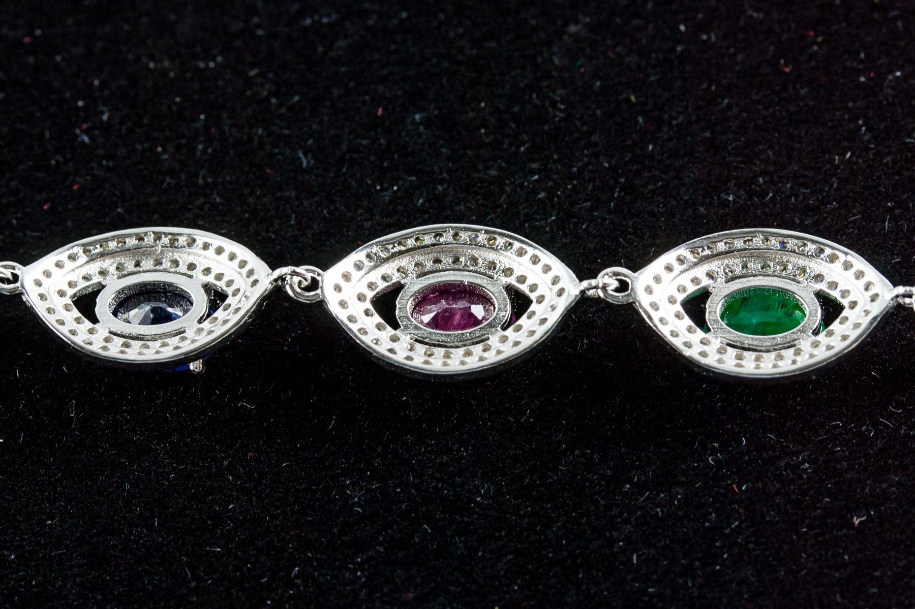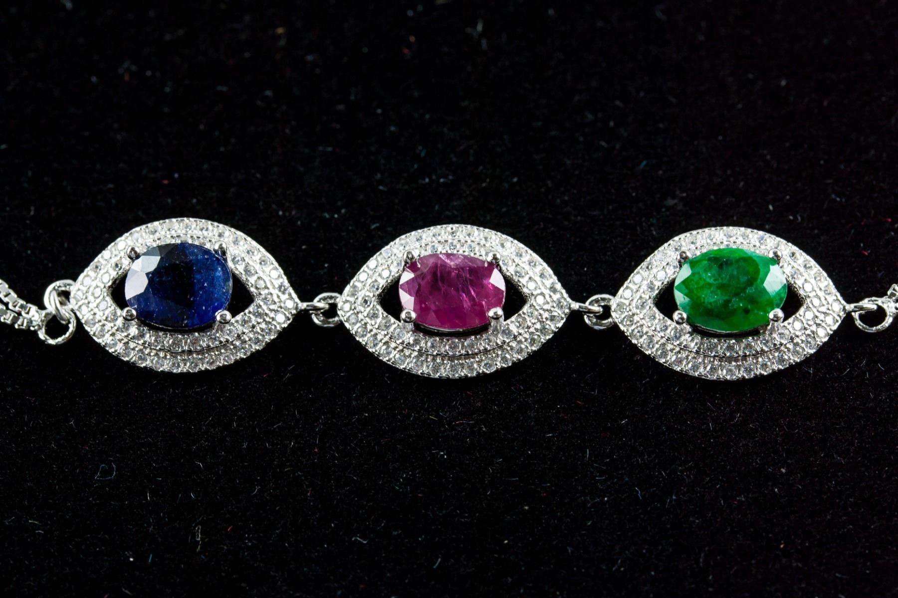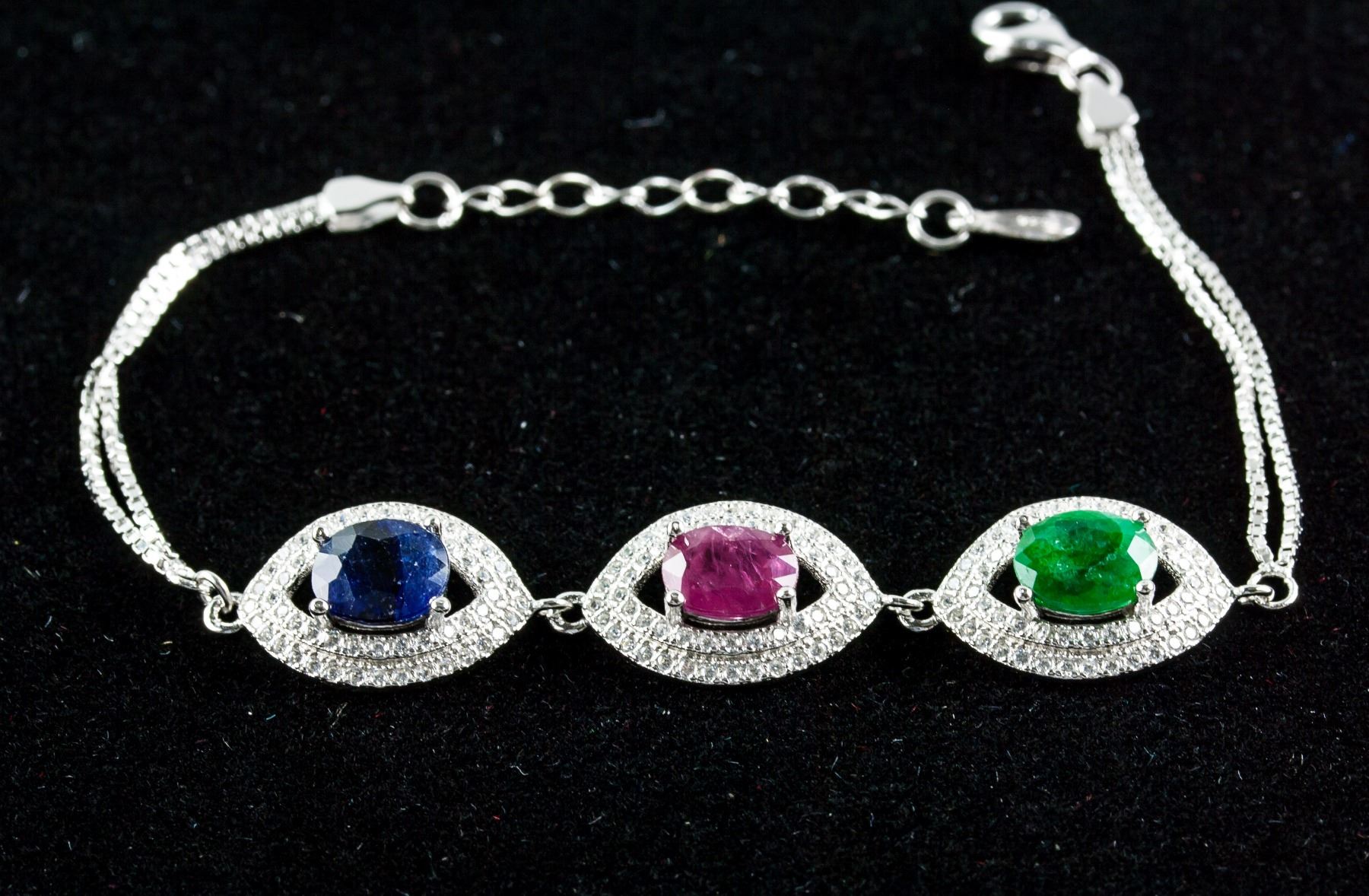 Stamped 925 silver bracelet. Set with 4.50ct oval cut, moderately-heavily included (treated) multi colored, sapphire, ruby and emerald, accompanied by cubic crystals. Certified replacement value $890. 6.50 grams