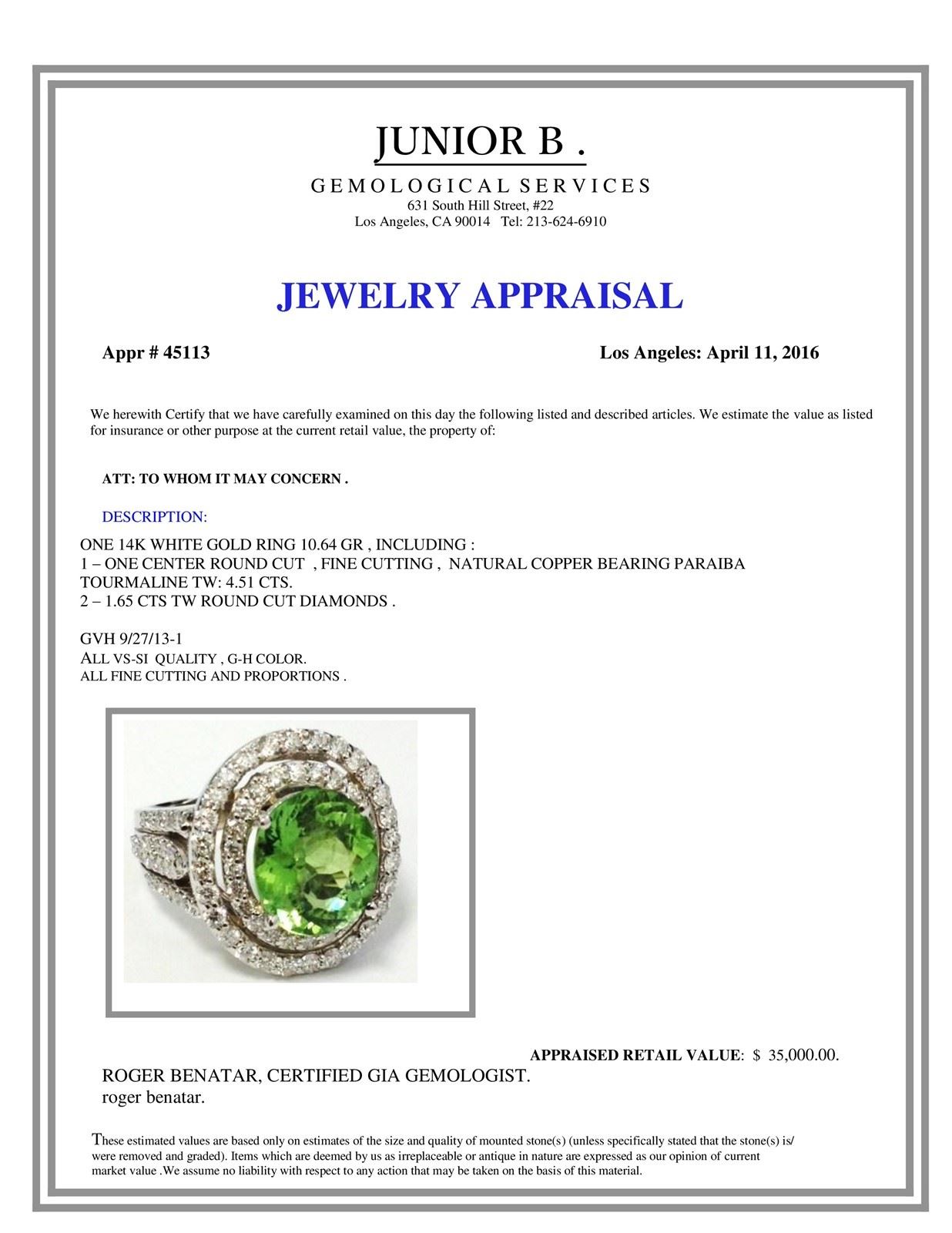18K WHITE GOLD NATURAL COPPER BEARING PARIBA TOURMALINE:10.64GRAMS/DIAMOND:1.65CT/COPPER BEARING PARIBA TOURMALINE:4.51CT/#GVR1168 **Tourmaline is well known for imparting properties of healing, strength and vitality. Brilliantly cast in 14K white gold, this 4.51ct Round Cut Natural Copper Bearing Paraiba Tourmaline esctatically hums in an octave reserved for supernovas, burst across the universe. Surrounded by dual twinkling halos of 1.65ct round cut Diamonds, this cocktail ring is an investment piece transcending all time and space. **