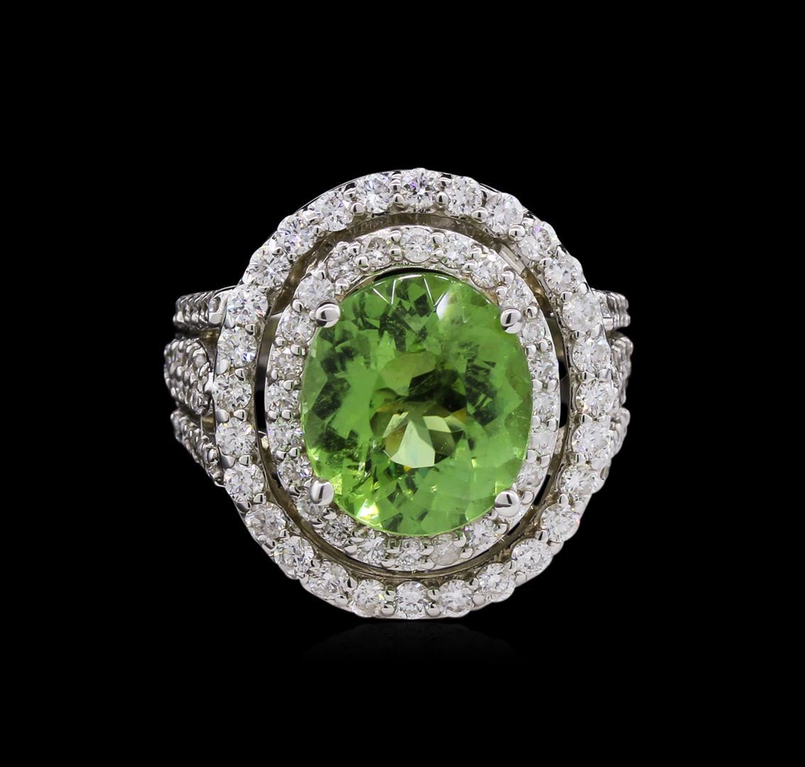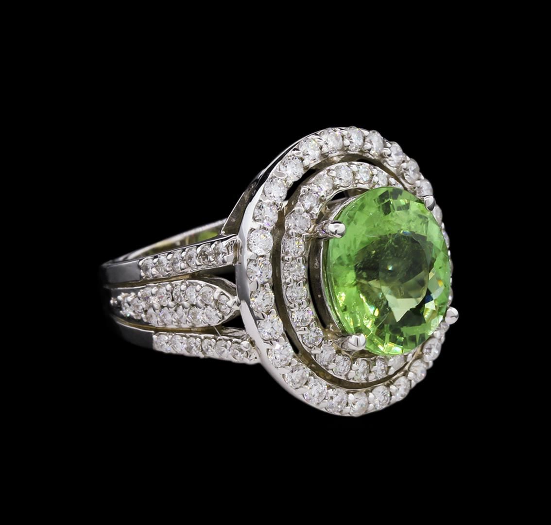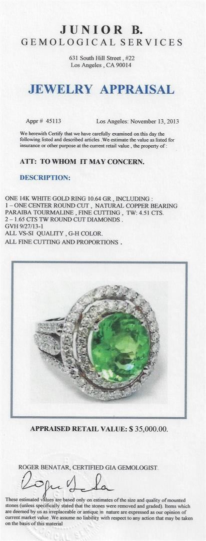 One 14KT White Gold ring 10.64 GR. Including: one center round cut, natural, copper bearing paraiba tourmaline, fine cutting, TW: 4.51 CTS. 1.65 CTS Tw round cut diamonds. All VS-SI Clarity, G-H Color Fine Cutting and Proportions. RBGS Appraised at $35,000.00.