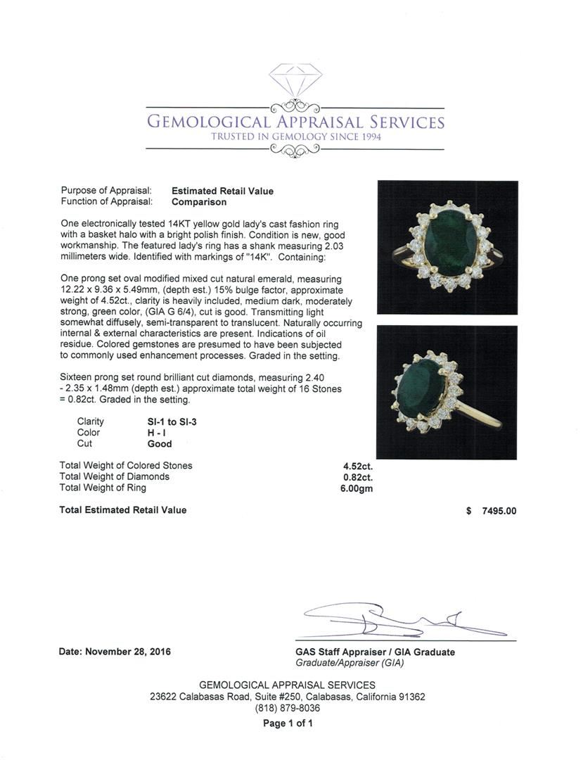 One electronically tested 14KT yellow gold lady's cast fashion ring with a basket halo with a bright polish finish. The featured lady's ring has a shank measuring 2.03 millimeters wide. Identified with markings of '14K'. Condition is new, good workmanship. Containing: One prong set oval modified mixed cut natural emerald, measuring 12.22 x 9.36 x 5.49mm, (depth est.) 15%. bulge factor, approximate weight of 4.52ct., clarity is heavily included, medium dark, moderately strong, green color, (GIA G 6/4), cut is good. Transmitting light somewhat diffusely, semi-transparent to translucent. Naturally occurring internal & external characteristics are present. Indications of oil residue. Colored gemstones are presumed to have been subjected to commonly used enhancement processes. Graded in the setting. Sixteen prong set round brilliant cut diamonds, measuring 2.40 - 2.35 x 1.48mm (depth est.) approximate total weight of 16 Stones = 0.82ct. Graded in the setting. Clarity SI-1 to SI-3. Color: H - I Cut Good. Total Weight of Colored Stones 4.52ct.. Total Weight of Diamonds 0.82ct.. Total Weight of Ring 6.00gm. GAS Appraised at $7,495.00.