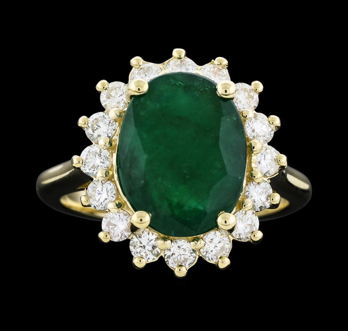One electronically tested 14KT yellow gold lady's cast fashion ring with a basket halo with a bright polish finish. The featured lady's ring has a shank measuring 2.03 millimeters wide. Identified with markings of '14K'. Condition is new, good workmanship. Containing: One prong set oval modified mixed cut natural emerald, measuring 12.22 x 9.36 x 5.49mm, (depth est.) 15%. bulge factor, approximate weight of 4.52ct., clarity is heavily included, medium dark, moderately strong, green color, (GIA G 6/4), cut is good. Transmitting light somewhat diffusely, semi-transparent to translucent. Naturally occurring internal & external characteristics are present. Indications of oil residue. Colored gemstones are presumed to have been subjected to commonly used enhancement processes. Graded in the setting. Sixteen prong set round brilliant cut diamonds, measuring 2.40 - 2.35 x 1.48mm (depth est.) approximate total weight of 16 Stones = 0.82ct. Graded in the setting. Clarity SI-1 to SI-3. Color: H - I Cut Good. Total Weight of Colored Stones 4.52ct.. Total Weight of Diamonds 0.82ct.. Total Weight of Ring 6.00gm. GAS Appraised.