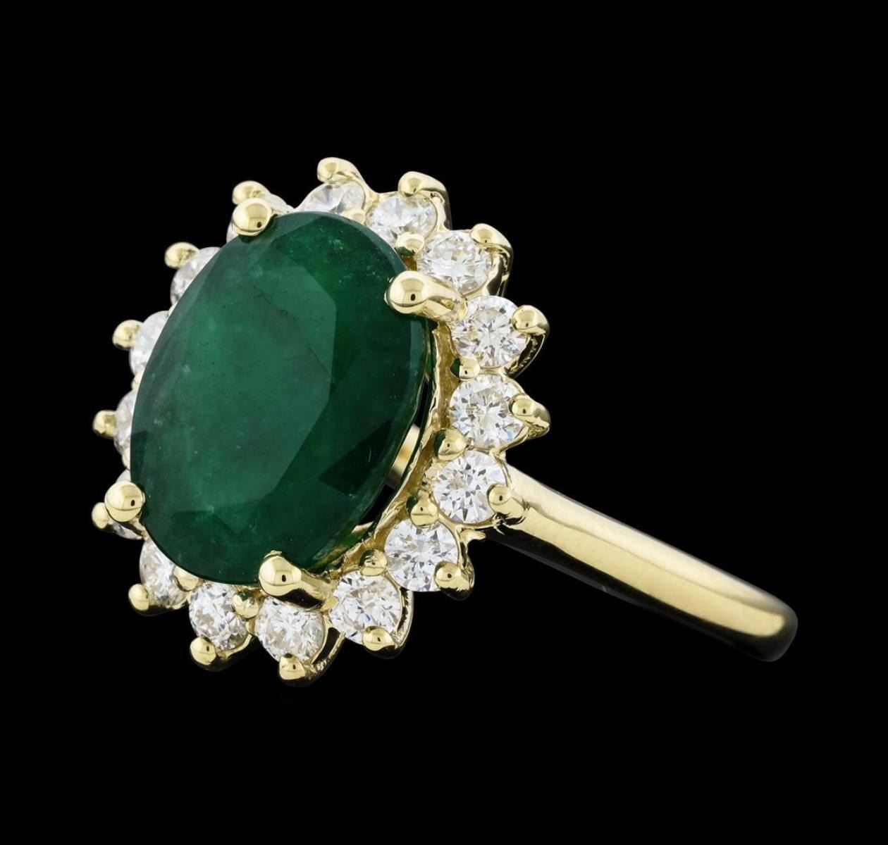 One electronically tested 14KT yellow gold lady's cast fashion ring with a basket halo with a bright polish finish. The featured lady's ring has a shank measuring 2.03 millimeters wide. Identified with markings of '14K'. Condition is new, good workmanship. Containing: One prong set oval modified mixed cut natural emerald, measuring 12.22 x 9.36 x 5.49mm, (depth est.) 15%. bulge factor, approximate weight of 4.52ct., clarity is heavily included, medium dark, moderately strong, green color, (GIA G 6/4), cut is good. Transmitting light somewhat diffusely, semi-transparent to translucent. Naturally occurring internal & external characteristics are present. Indications of oil residue. Colored gemstones are presumed to have been subjected to commonly used enhancement processes. Graded in the setting. Sixteen prong set round brilliant cut diamonds, measuring 2.40 - 2.35 x 1.48mm (depth est.) approximate total weight of 16 Stones = 0.82ct. Graded in the setting. Clarity SI-1 to SI-3. Color: H - I Cut Good. Total Weight of Colored Stones 4.52ct.. Total Weight of Diamonds 0.82ct.. Total Weight of Ring 6.00gm. GAS Appraised.