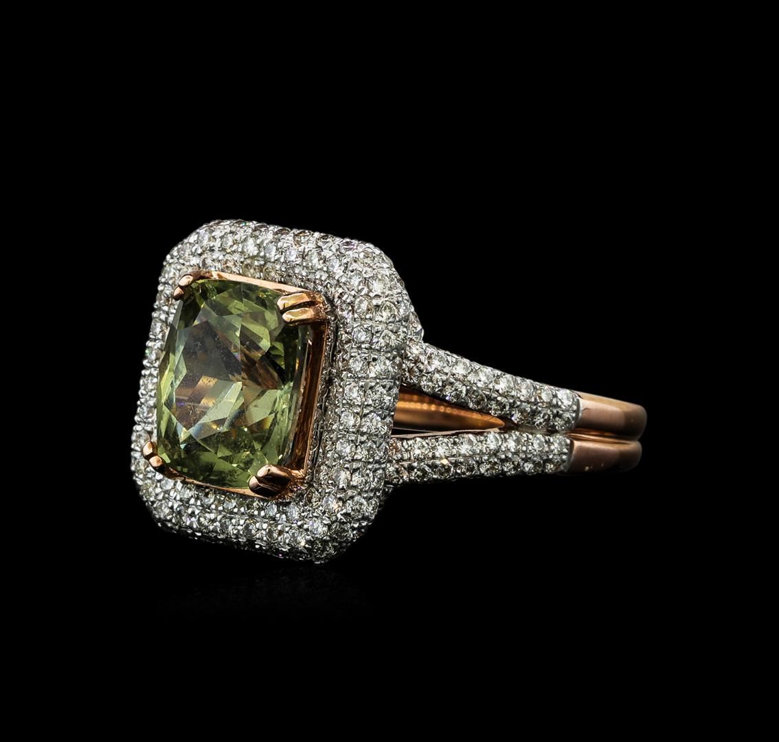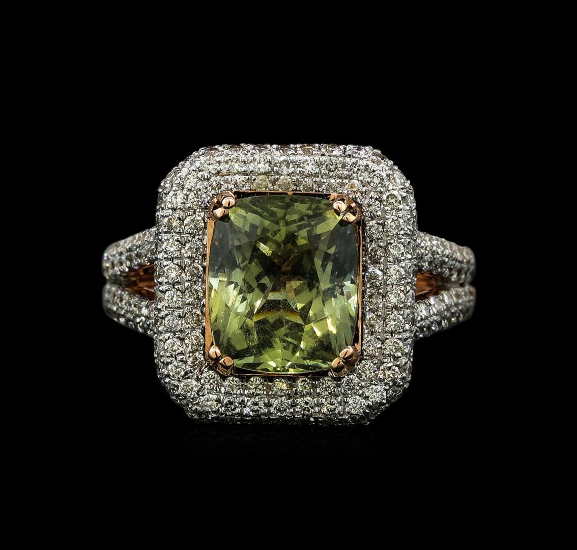 One electronically tested 14KT rose gold lady's cast fashion ring with a split shank basket halo with a bright polish finish. The featured lady's ring has a double shank measuring 3.00 millimeters wide. Identified with markings of '14K'. Condition is new, good workmanship. Containing: One prong set rectangular cushion modified brilliant cut natural green sapphire, measuring 8.66 x 8.23 x 6.09mm, (depth est.) 10%. bulge factor, approximate weight of 4.52ct., clarity is slightly included, light, very slightly grayish, yellow green color, (GIA YG 3/3), cut is very good. Transmitting light with a minimum of distortion, transparent. No indications of heat treatment. Graded in the setting in the GIA Laboratory, Report #5171500747. Two Hundred Twenty-Six prong set round brilliant cut diamonds, measuring 1.20 - 1.15 x 0.71mm (depth est.) approximate total weight of 226 Stones = 1.34ct. Graded in the setting. Clarity VS-2 to SI-1. Color: H - I Cut Good. Total Weight of Colored Stones 4.52ct.. Total Weight of Diamonds 1.34ct.. Total Weight of Ring 7.90gm GAS Appraised at $16,365.00.