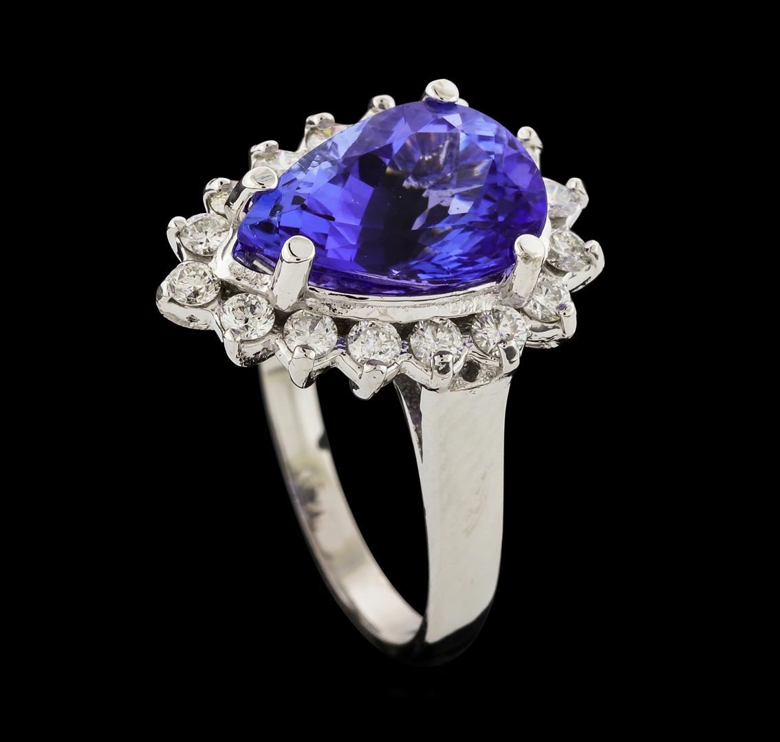 One electronically tested 14KT white gold lady's cast fashion ring with a basket halo with a bright polish finish. The featured lady's ring has a shank measuring 2.14 millimeters wide. Identified with markings of '14K'. Condition is new, good workmanship. Containing: One prong set pear modified brilliant cut natural tanzanite, measuring 12.73 x 8.90 x 6.67mm, (depth est.) approximate weight of 4.52ct., clarity is eye clean, medium, moderately strong, violet color, (GIA V 5/4), cut is very good. Transmitting light with no distortion, transparent. Colored gemstones are presumed to have been subjected to commonly used enhancement processes. Graded in the setting. Sixteen prong set round brilliant cut diamonds, measuring 2.25 - 2.15 x 1.32mm (depth est.) approximate total weight of 16 Stones = 0.62ct. Graded in the setting. Clarity SI-1 to SI-2. Color: G - H Cut Good. Total Weight of Colored Stones 4.52ct.. Total Weight of Diamonds 0.62ct.. Total Weight of Ring 6.10gm GAS Appraised at $8,705.00.