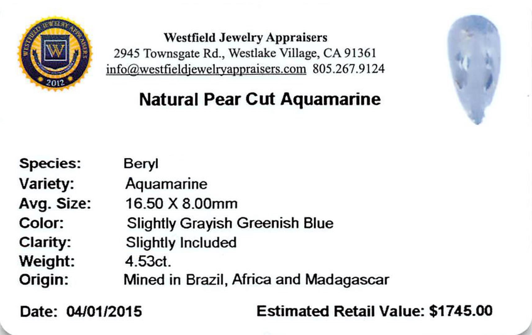 One pear cut natural aquamarine exact weight 4.53ct., clarity is slightly included, type I, medium, slightly grayish, very slightly greenish blue color, (GIA vslgB 5/2), cut is good. Westfield Appraised at $1,745.00.