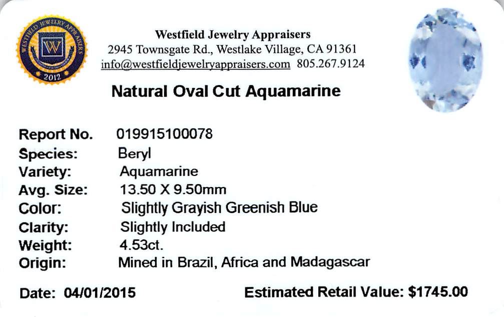 One oval cut natural aquamarine exact weight 4.53ct., clarity is slightly included, type I, medium light, very slightly grayish, very slightly greenish blue color, (GIA vslgB 4/3), cut is good. Westfield Appraised at $1,745.00.