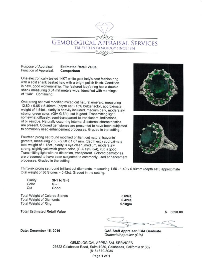 One electronically tested 14KT white gold lady's cast fashion ring with a split shank basket halo with a bright polish finish. The featured lady's ring has a double shank measuring 3.34 millimeters wide. Identified with markings of '14K'. Condition is new, good workmanship. Containing: One prong set oval modified mixed cut natural emerald, measuring 12.80 x 9.65 x 5.45mm, (depth est.) 15%. bulge factor, approximate weight of 4.54ct., clarity is heavily included, medium dark, moderately strong, green color, (GIA G 6/4), cut is good. Transmitting light somewhat diffusely, semi-transparent to translucent. Indications of oil residue. Naturally occurring internal & external characteristics are present. Colored gemstones are presumed to have been subjected to commonly used enhancement processes. Graded in the setting. Fourteen prong set round modified brilliant cut natural tsavorite garnets, measuring 2.60 - 2.50 x 1.67 mm, (depth est.) approximate total weight of 1.15ct., clarity is eye clean, medium, moderately strong, slightly yellowish green color, (GIA slyG 5/4), cut is good. Transmitting light with no distortion, transparent. Colored gemstones are presumed to have been subjected to commonly used enhancement processes. Graded in the setting. Thirty-Six prong set round brilliant cut diamonds, measuring 1.50 - 1.40 x 0.90mm (depth est.) approximate total weight of 36 Stones = 0.42ct. Graded in the setting. Clarity SI-1 to SI-3. Color: G - I Cut Good. Total Weight of Colored Stones 5.69ct.. Total Weight of Diamonds 0.42ct.. Total Weight of Ring 9.10gm. GAS Appraised at $6,690.00.