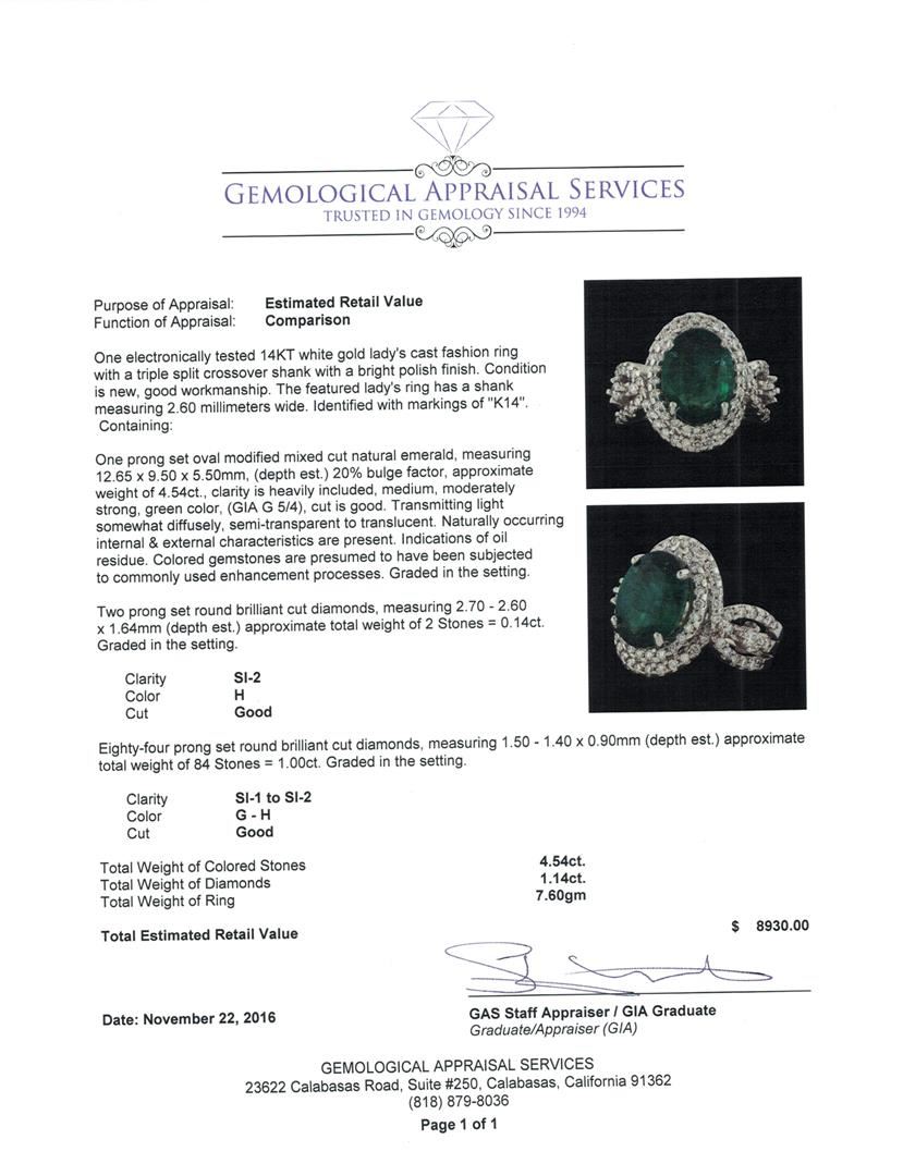 One electronically tested 14KT white gold lady's cast fashion ring with a triple split crossover shank with a bright polish finish. The featured lady's ring has a shank measuring 2.60 millimeters wide. Identified with markings of 'K14'. Condition is new, good workmanship. Containing: One prong set oval modified mixed cut natural emerald, measuring 12.65 x 9.50 x 5.50mm, (depth est.) 20%. bulge factor, approximate weight of 4.54ct., clarity is heavily included, medium, moderately strong, green color, (GIA G 5/4), cut is good. Transmitting light somewhat diffusely, semi-transparent to translucent. Naturally occurring internal & external characteristics are present. Indications of oil residue. Colored gemstones are presumed to have been subjected to commonly used enhancement processes. Graded in the setting. Two prong set round brilliant cut diamonds, measuring 2.70 - 2.60 x 1.64mm (depth est.) approximate total weight of 2 Stones = 0.14ct. Graded in the setting. Clarity SI-2. Color: H Cut Good Eighty-Four prong set round brilliant cut diamonds, measuring 1.50 - 1.40 x 0.90mm (depth est.) approximate total weight of 84 Stones = 1.00ct. Graded in the setting. Clarity SI-1 to SI-2. Color: G - H Cut Good. Total Weight of Colored Stones 4.54ct.. Total Weight of Diamonds 1.14ct.. Total Weight of Ring 7.60gm. GAS Appraised at $8,930.00.