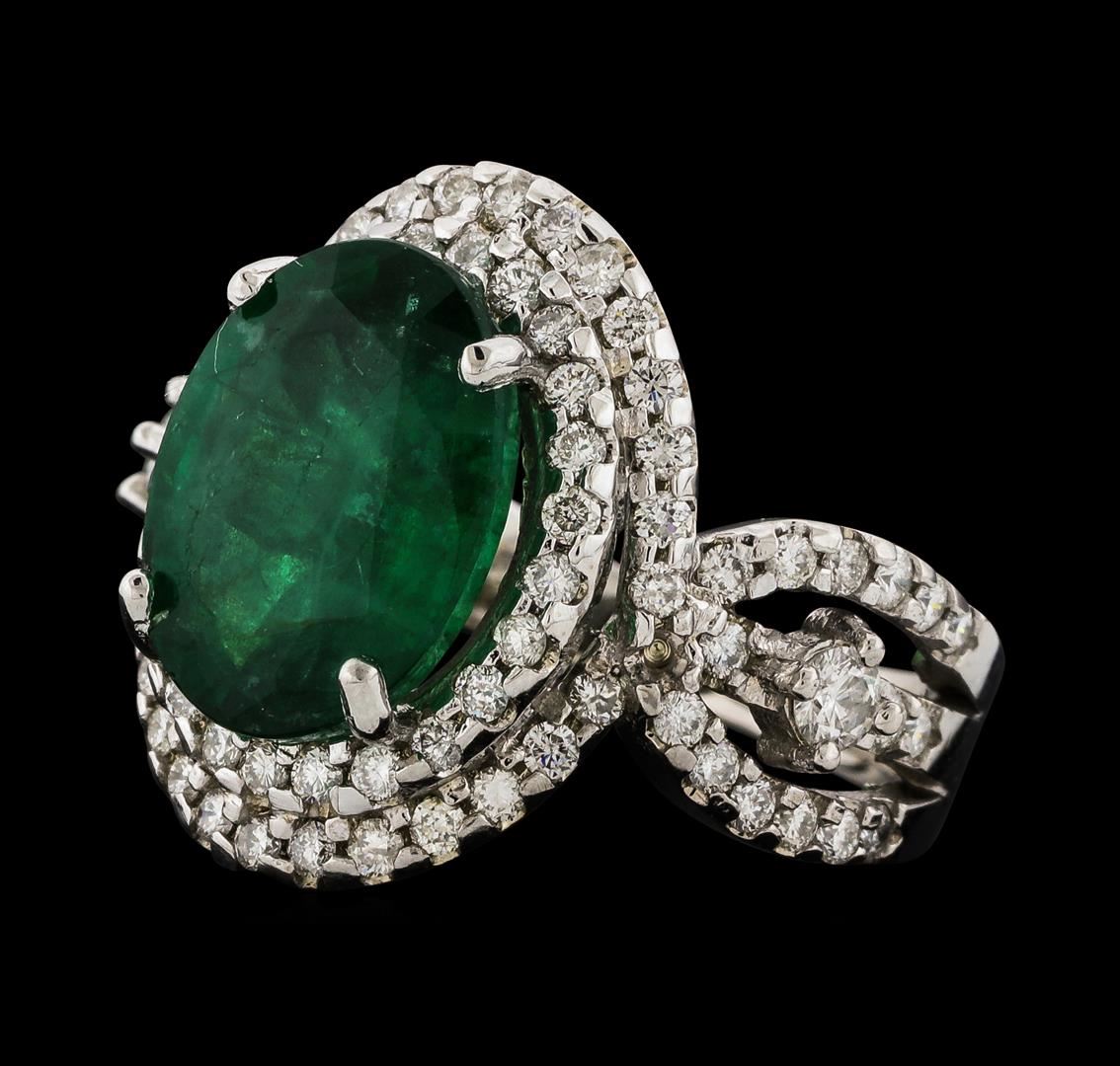 One electronically tested 14KT white gold lady's cast fashion ring with a triple split crossover shank with a bright polish finish. The featured lady's ring has a shank measuring 2.60 millimeters wide. Identified with markings of 'K14'. Condition is new, good workmanship. Containing: One prong set oval modified mixed cut natural emerald, measuring 12.65 x 9.50 x 5.50mm, (depth est.) 20%. bulge factor, approximate weight of 4.54ct., clarity is heavily included, medium, moderately strong, green color, (GIA G 5/4), cut is good. Transmitting light somewhat diffusely, semi-transparent to translucent. Naturally occurring internal & external characteristics are present. Indications of oil residue. Colored gemstones are presumed to have been subjected to commonly used enhancement processes. Graded in the setting. Two prong set round brilliant cut diamonds, measuring 2.70 - 2.60 x 1.64mm (depth est.) approximate total weight of 2 Stones = 0.14ct. Graded in the setting. Clarity SI-2. Color: H Cut Good Eighty-Four prong set round brilliant cut diamonds, measuring 1.50 - 1.40 x 0.90mm (depth est.) approximate total weight of 84 Stones = 1.00ct. Graded in the setting. Clarity SI-1 to SI-2. Color: G - H Cut Good. Total Weight of Colored Stones 4.54ct.. Total Weight of Diamonds 1.14ct.. Total Weight of Ring 7.60gm. GAS Appraised at $8,930.00.