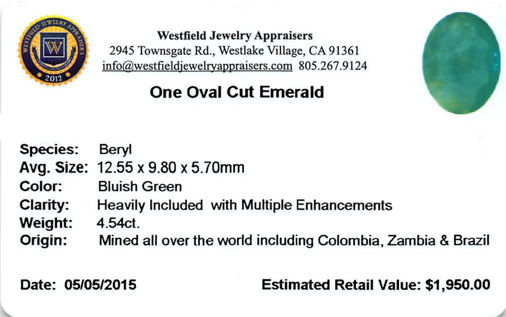 One oval mixed cut natural emerald, measuring 12.55 x 9.80 x 5.70mm, exact weight 4.54ct., clarity is heavily included, type III, dark, very slightly grayish, bluish green color, (GIA bG 7/3), cut is good. Indications of multiple laboratory enhancements, including high temperature heat treatment. Westfield Appraised at $1,950.00.