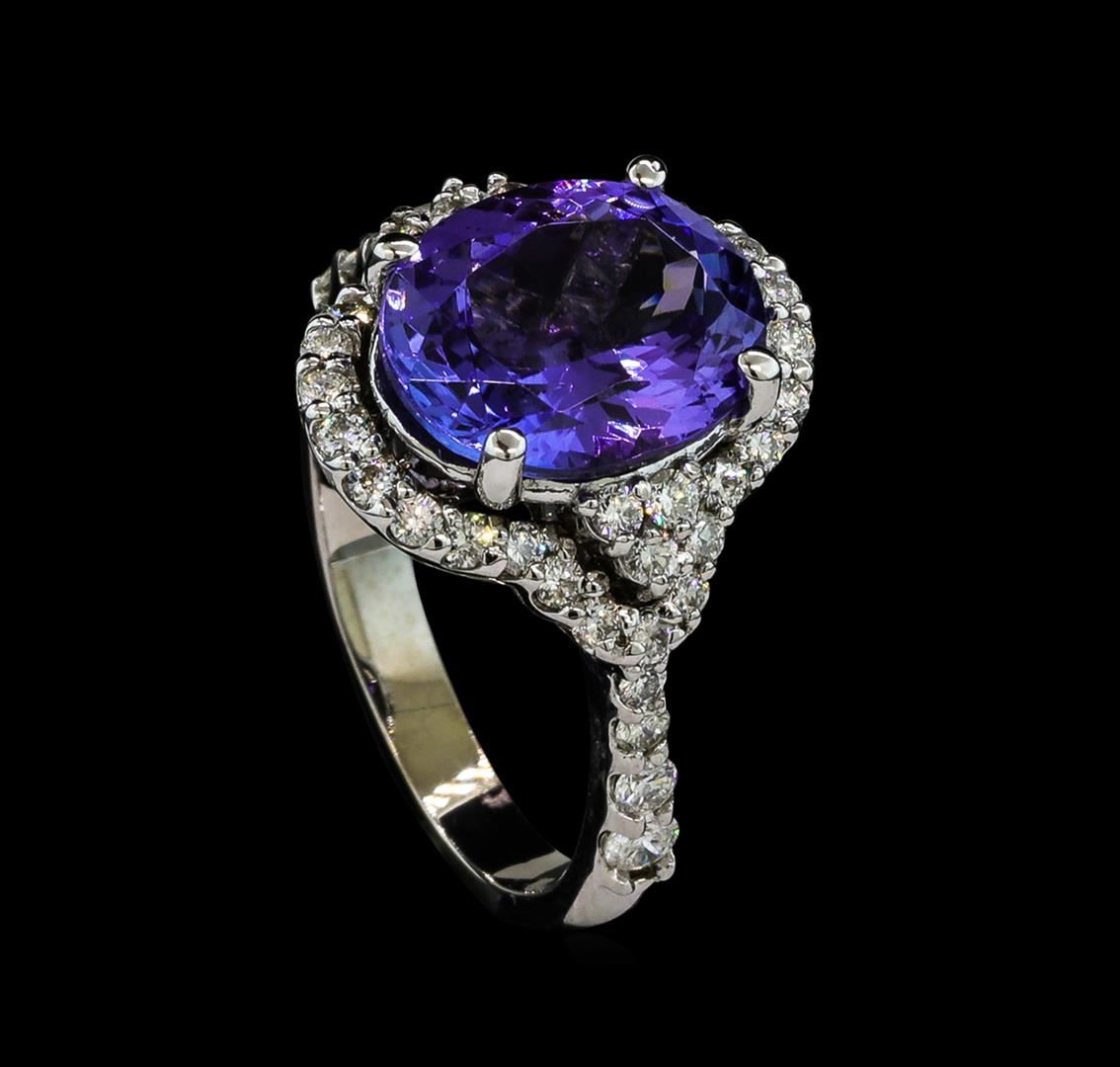 One electronically tested 14KT white gold lady's combination cast & assembled fashion ring with a basket halo with a bright polish finish. The featured lady's ring has diamonds set in a triangular shape on the shoulder with a shank measuring 2.64 millimeters wide. Identified with markings of 'K14'. Condition is new, good workmanship. Containing: One prong set oval modified brilliant cut natural tanzanite, measuring 11.33 x 9.29 x 6.04mm, (depth est.) approximate weight of 4.54ct., clarity is eye clean, medium, moderately strong, bluish violet color, (GIA bV 5/4), cut is very good. Transmitting light with no distortion, transparent. Colored gemstones are presumed to have been subjected to commonly used enhancement processes. Graded in the setting. Four prong set round brilliant cut diamonds, measuring 2.30 - 2.00 x 1.33mm (depth est.) approximate total weight of 4 Stones = 0.15ct. Graded in the setting. Clarity SI-1 to I-1. Color: H - I Cut Good Thirty-Eight prong set round brilliant cut diamonds, measuring 1.70 - 1.50 x 0.99mm (depth est.) approximate total weight of 38 Stones = 0.59ct. Graded in the setting. Clarity SI-1 to I-1. Color: G - H Cut Good. Total Weight of Colored Stones 4.54ct.. Total Weight of Diamonds 0.74ct.. Total Weight of Ring 6.00gm GAS Appraised at $9,775.00.