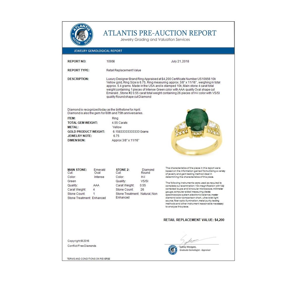 REF-63X6T -10956 ---- 4.55 CTW Emerald & Diamond Ring 10K Yellow Gold ---- Luxury Designer Brand Ring Appraised at $4,200 Certificate Number US10956 10k Yellow gold, Ring Size is 6.75, Ring measuring approx. 3/8" x 11/16" , weighing in total approx. 5.4 grams. Made in the USA and is stamped 10k, Main stone 4 carat total weight containing 1 pieces of Intense Green color with AAA quality Oval shape cut Emerald , Stone #2 0.55 carat total weight containing 26 pieces of H-I color with VS/SI quality Round shape cut Diamond