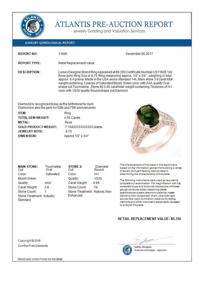 REF-121W5F -11605 ---- 4.55 CTW Green Tourmaline & Diamond Ring 14K Rose Gold ---- Luxury Designer Brand Ring Appraised at $9,350 Certificate Number US11605 14k Rose gold, Ring Size is 6.75, Ring measuring approx. 1/2" x 3/4" , weighing in total approx. 6.4 grams. Made in the USA and is stamped 14k, Main stone 3.6 carat total weight containing 1 pieces of Saturated Bluish Green color with AAA quality Oval shape cut Tourmaline , Stone #2 0.95 carat total weight containing 78 pieces of H-I color with VS/SI quality Round shape cut Diamond