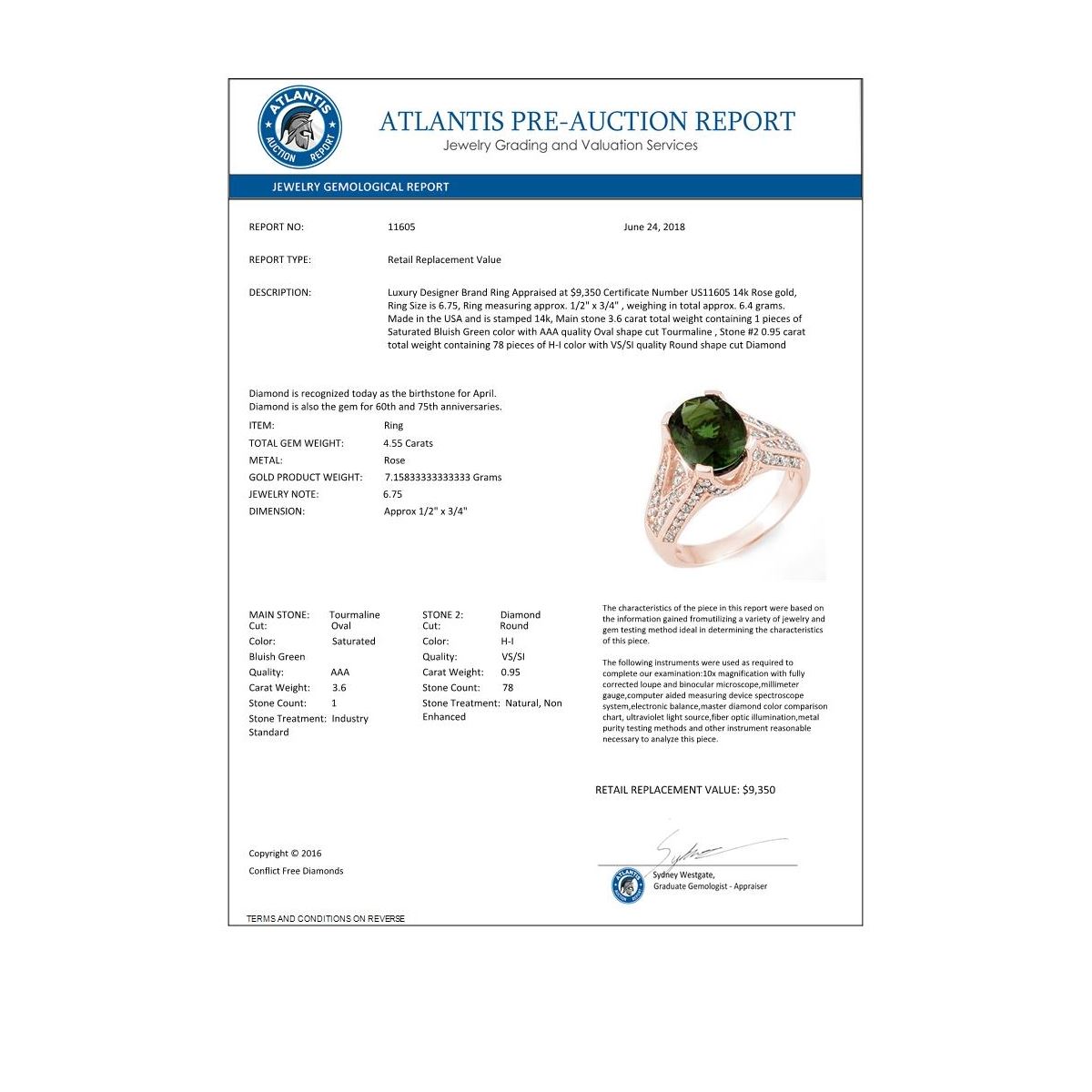 REF-121W5F -11605 ---- 4.55 CTW Green Tourmaline & Diamond Ring 14K Rose Gold ---- Luxury Designer Brand Ring Appraised at $9,350 Certificate Number US11605 14k Rose gold, Ring Size is 6.75, Ring measuring approx. 1/2" x 3/4" , weighing in total approx. 6.4 grams. Made in the USA and is stamped 14k, Main stone 3.6 carat total weight containing 1 pieces of Saturated Bluish Green color with AAA quality Oval shape cut Tourmaline , Stone #2 0.95 carat total weight containing 78 pieces of H-I color with VS/SI quality Round shape cut Diamond