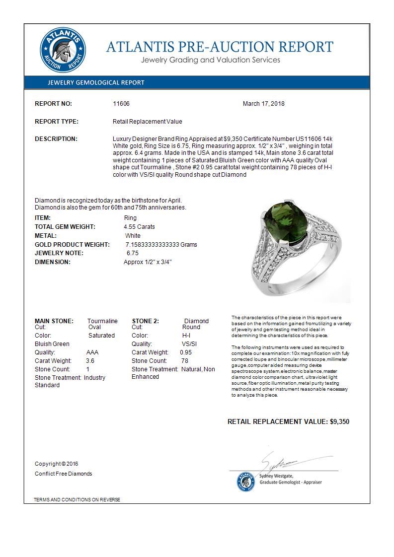 REF-121H5A -11606 ---- 4.55 CTW Green Tourmaline & Diamond Ring 14K White Gold ---- Luxury Designer Brand Ring Appraised at $9,350 Certificate Number US11606 14k White gold, Ring Size is 6.75, Ring measuring approx. 1/2" x 3/4" , weighing in total approx. 6.4 grams. Made in the USA and is stamped 14k, Main stone 3.6 carat total weight containing 1 pieces of Saturated Bluish Green color with AAA quality Oval shape cut Tourmaline , Stone #2 0.95 carat total weight containing 78 pieces of H-I color with VS/SI quality Round shape cut Diamond