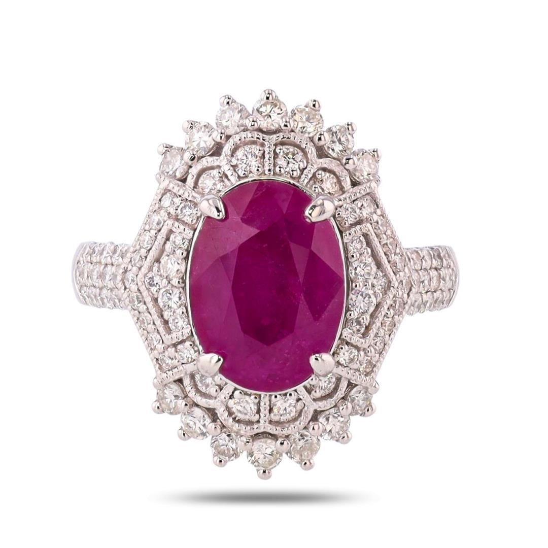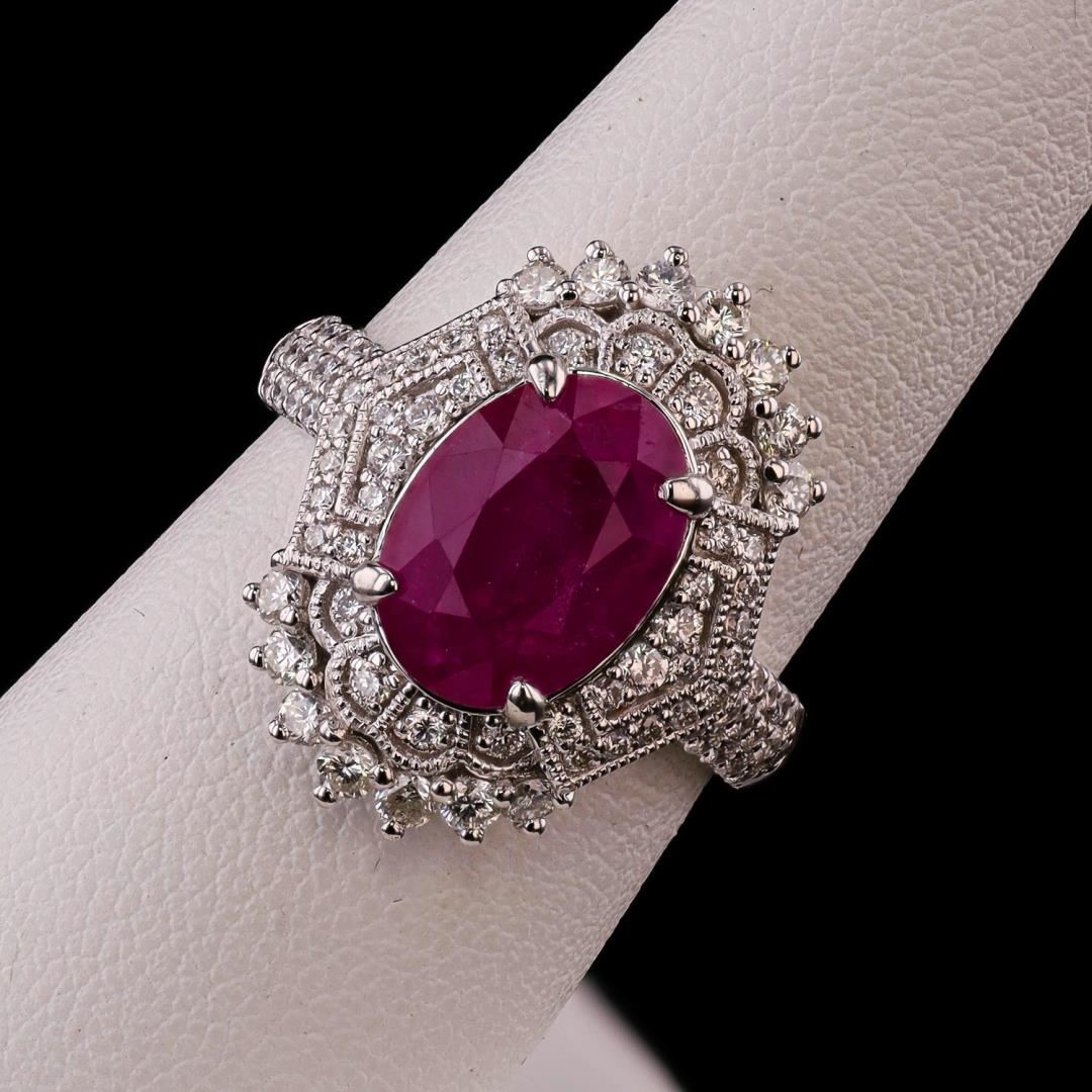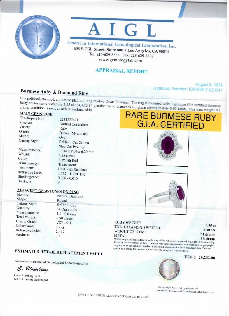 One polished, stamped, and tested platinum ring marked Oscar Friedman. The ring is mounted with: 1 genuine GIA certified Burmese Ruby center stone weighing 4.55 carats, and 84 genuine round diamonds weighing approximately 0.90 carats. This item weighs 9.1 grams, condition is new, excellent workmanship. #MAIN GEMSTONE# GIA Report No.: 2231227421; Species: Natural Corundum; Variety: Ruby; Origin: Burma (Myanmar); Shape: Oval; Cutting Style: Brilliant Cut Crown, Step Cut Pavilion; Measurements: 10.88 x 8.04 x 6.22mm; Weight: 4.55 carats; Color: Purplish Red; Transparency: Transparent; Treatment: Heat with Residues; Refractive Index: 1.762 - 1.770 DR; Birefringence: 0.008 - 0.010; Hardness: 9 #ADJACENT GEMSTONES ON RING# Identity: Natural Diamond; Shape: Round; Cutting Style: Brilliant Cut; Quantity: 84 Diamonds; Measurements: 1.0 - 2.0mm; Total Weight: 0.90 carats; Clarity Grade: VS2-SI1; Color Grade: F-G; Refractive Index: 2.417; Hardness: 10 #RUBY WEIGHT: 4.55 ct; TOTAL DIAMOND WEIGHT: 0.90 cts; WEIGHT OF ITEM: 9.1 grams; METAL: Platinum #Size: 7