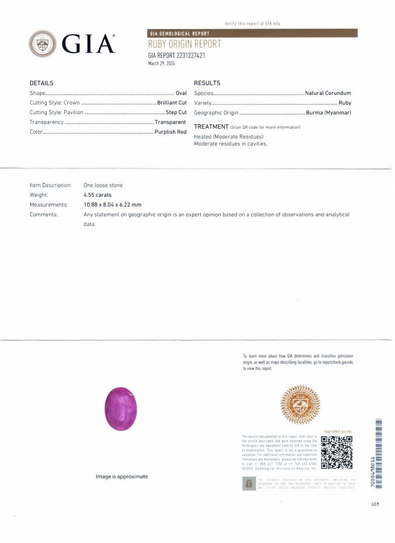 One polished, stamped, and tested platinum ring marked Oscar Friedman. The ring is mounted with: 1 genuine GIA certified Burmese Ruby center stone weighing 4.55 carats, and 84 genuine round diamonds weighing approximately 0.90 carats. This item weighs 9.1 grams, condition is new, excellent workmanship. #MAIN GEMSTONE# GIA Report No.: 2231227421; Species: Natural Corundum; Variety: Ruby; Origin: Burma (Myanmar); Shape: Oval; Cutting Style: Brilliant Cut Crown, Step Cut Pavilion; Measurements: 10.88 x 8.04 x 6.22mm; Weight: 4.55 carats; Color: Purplish Red; Transparency: Transparent; Treatment: Heat with Residues; Refractive Index: 1.762 - 1.770 DR; Birefringence: 0.008 - 0.010; Hardness: 9 #ADJACENT GEMSTONES ON RING# Identity: Natural Diamond; Shape: Round; Cutting Style: Brilliant Cut; Quantity: 84 Diamonds; Measurements: 1.0 - 2.0mm; Total Weight: 0.90 carats; Clarity Grade: VS2-SI1; Color Grade: F-G; Refractive Index: 2.417; Hardness: 10 #RUBY WEIGHT: 4.55 ct; TOTAL DIAMOND WEIGHT: 0.90 cts; WEIGHT OF ITEM: 9.1 grams; METAL: Platinum #Size: 7