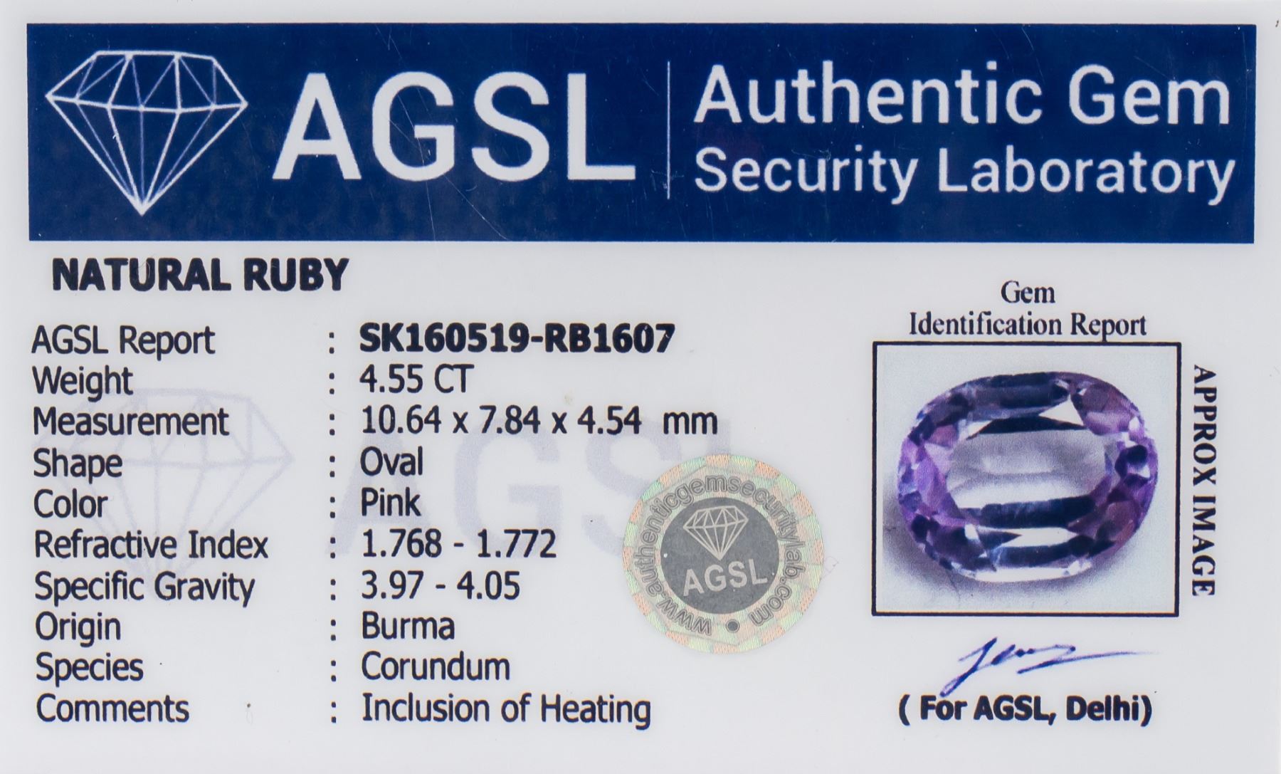 One (1) 4.55 Ct oval cut pink natural ruby gemstone. 10.64 x 7.84 x 4.54 mm. Origin: Burma. Accompanied with AGSL certificate.