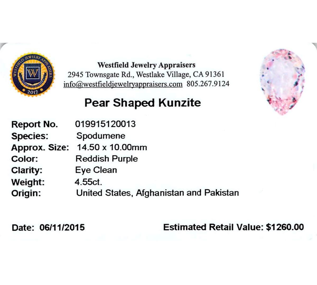 One pear mixed cut natural kunzite, measuring 14.50 x 10.00 x 5.50mm, exact weight 4.55ct., clarity is eye clean, type I, medium light, very slightly grayish, reddish purple color, (GIA rP 4/3), cut is good. Transmitting light with no distortion, transparent. Westfield Appraised at $1,260.00.