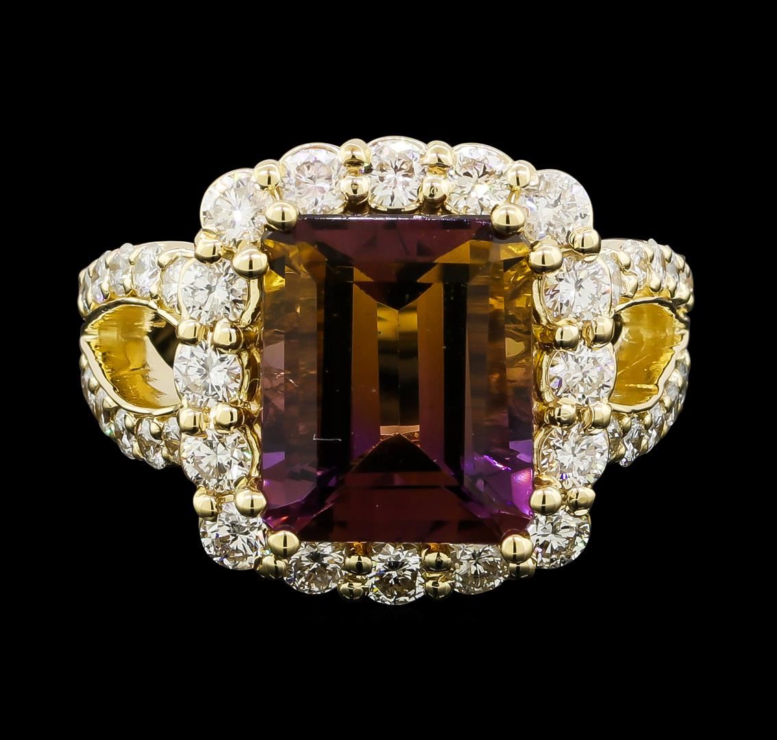 One electronically tested 14KT yellow gold lady's cast fashion ring with a split shank basket halo with a bright polish finish. The featured lady's ring has a double shank measuring 3.64 millimeters wide. Identified with markings of '14K'. Condition is new, good workmanship. Containing: One prong set emerald standard step cut natural ametrine quartz, measuring 11.29 x 9.30 x 6.14mm, (depth est.) approximate weight of 4.56ct., clarity is eye clean, medium, moderately strong, purple color, (GIA P 5/4) to medium, brownish, yellowish orange, (GIA yO 5/3), cut is very good. Transmitting light with no distortion, transparent. Colored gemstones are presumed to have been subjected to commonly used enhancement processes. Graded in the setting. Sixteen prong set round brilliant cut diamonds, measuring 2.55 - 2.45 x 1.55mm (depth est.) approximate total weight of 16 Stones = 0.95ct. Graded in the setting. Clarity SI-1 to SI-2. Color: H - I Cut Good Twenty-Eight prong set round brilliant cut diamonds, measuring 1.90 - 1.85 x 1.17mm (depth est.) approximate total weight of 28 Stones = 0.70ct. Graded in the setting. Clarity SI-1 to I-1. Color: H - I Cut Good. Total Weight of Colored Stones 4.56ct.. Total Weight of Diamonds 1.65ct.. Total Weight of Ring 9.90gm. GAS Appraised at $5,650.00.