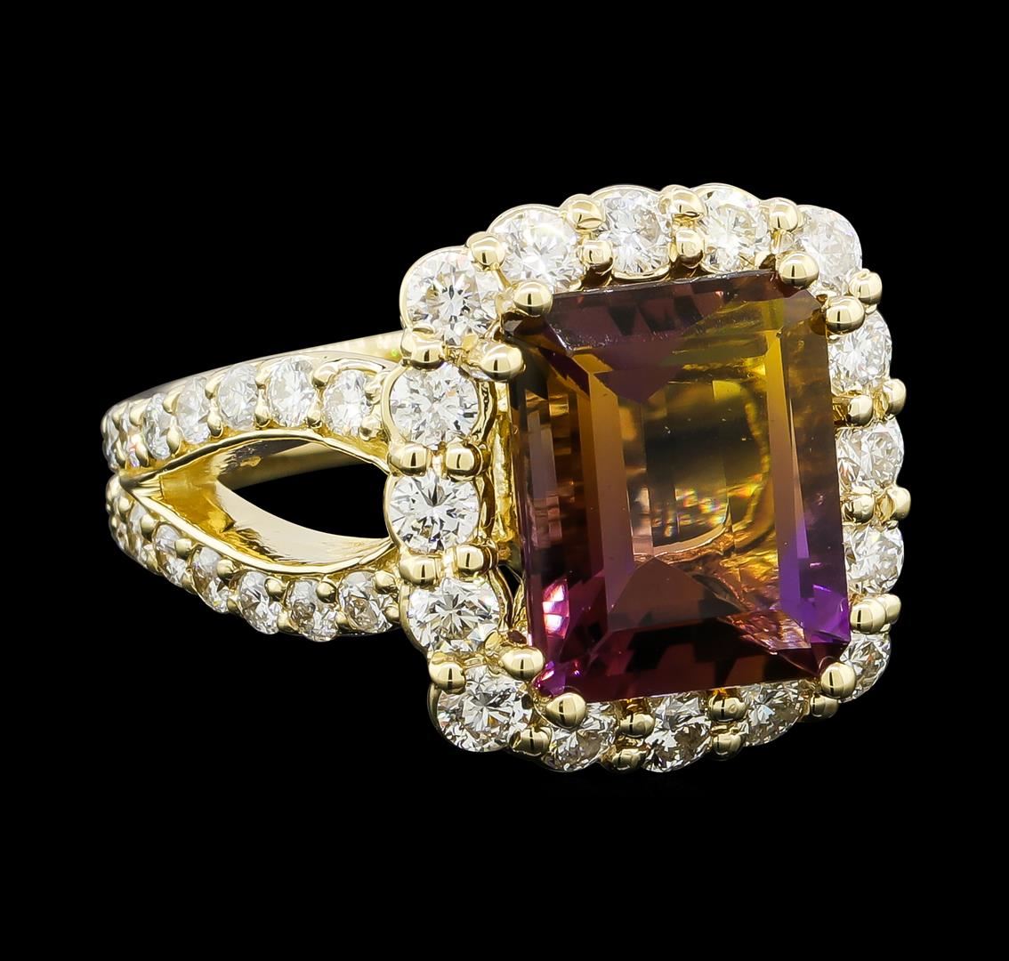 One electronically tested 14KT yellow gold lady's cast fashion ring with a split shank basket halo with a bright polish finish. The featured lady's ring has a double shank measuring 3.64 millimeters wide. Identified with markings of '14K'. Condition is new, good workmanship. Containing: One prong set emerald standard step cut natural ametrine quartz, measuring 11.29 x 9.30 x 6.14mm, (depth est.) approximate weight of 4.56ct., clarity is eye clean, medium, moderately strong, purple color, (GIA P 5/4) to medium, brownish, yellowish orange, (GIA yO 5/3), cut is very good. Transmitting light with no distortion, transparent. Colored gemstones are presumed to have been subjected to commonly used enhancement processes. Graded in the setting. Sixteen prong set round brilliant cut diamonds, measuring 2.55 - 2.45 x 1.55mm (depth est.) approximate total weight of 16 Stones = 0.95ct. Graded in the setting. Clarity SI-1 to SI-2. Color: H - I Cut Good Twenty-Eight prong set round brilliant cut diamonds, measuring 1.90 - 1.85 x 1.17mm (depth est.) approximate total weight of 28 Stones = 0.70ct. Graded in the setting. Clarity SI-1 to I-1. Color: H - I Cut Good. Total Weight of Colored Stones 4.56ct.. Total Weight of Diamonds 1.65ct.. Total Weight of Ring 9.90gm. GAS Appraised at $5,650.00.