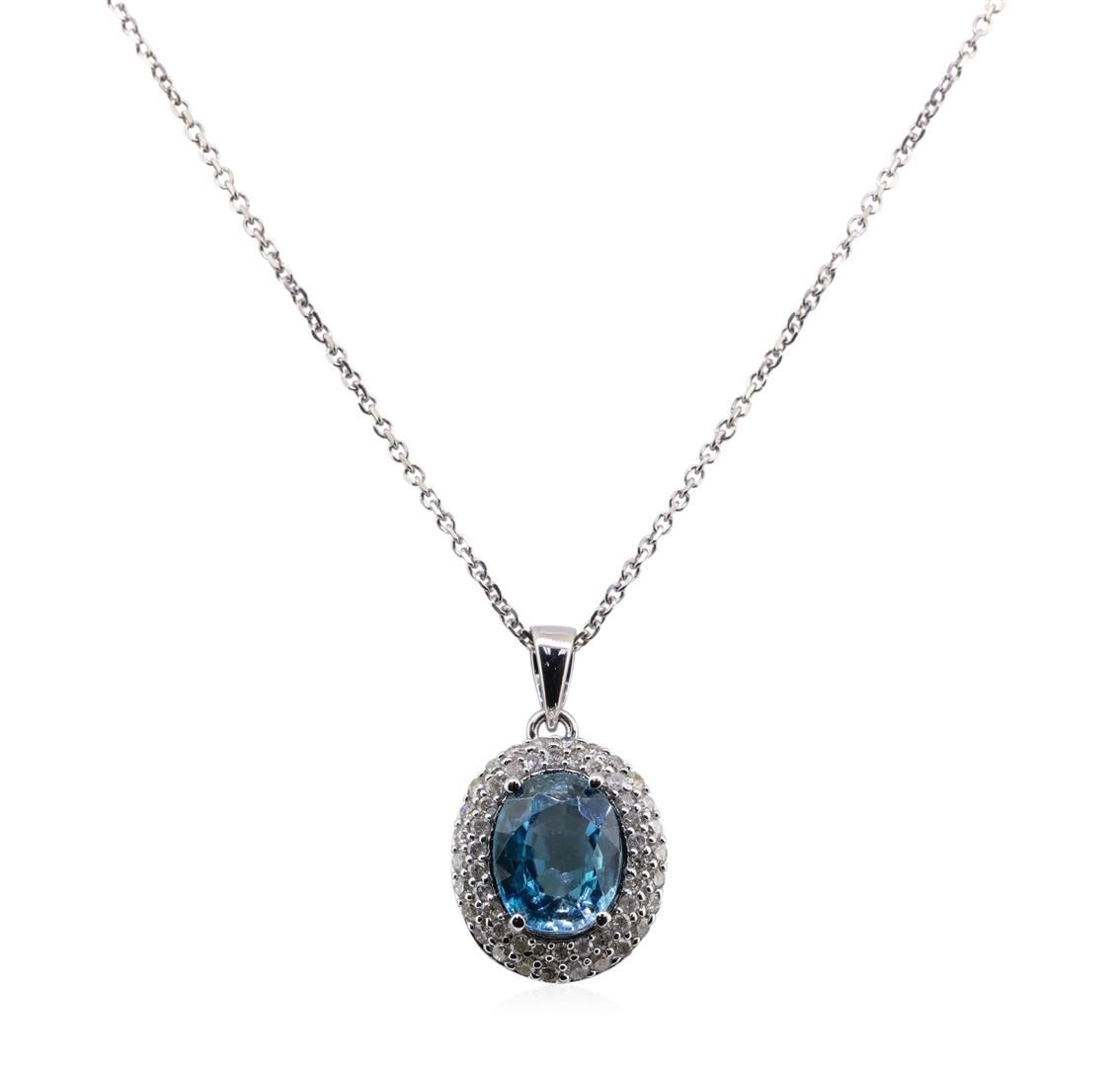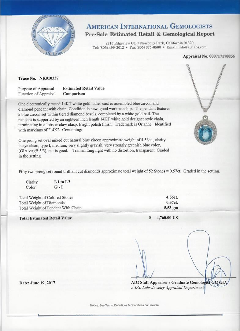 One 4.56ct Blue Zircon and Diamond Pendant With Chain - 14KT White Gold. AIG certified. See Appraisal for more details. AIG Appraised.