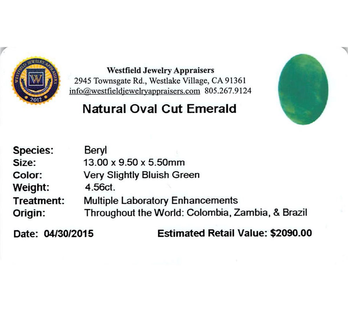 One oval mixed cut natural emerald exact weight 4.56ct., clarity is heavily included, type III, medium dark, very slightly grayish, very slightly bluish green color, (GIA vslbG 6/3), cut is good. Westfield Appraised at $2,090.00.