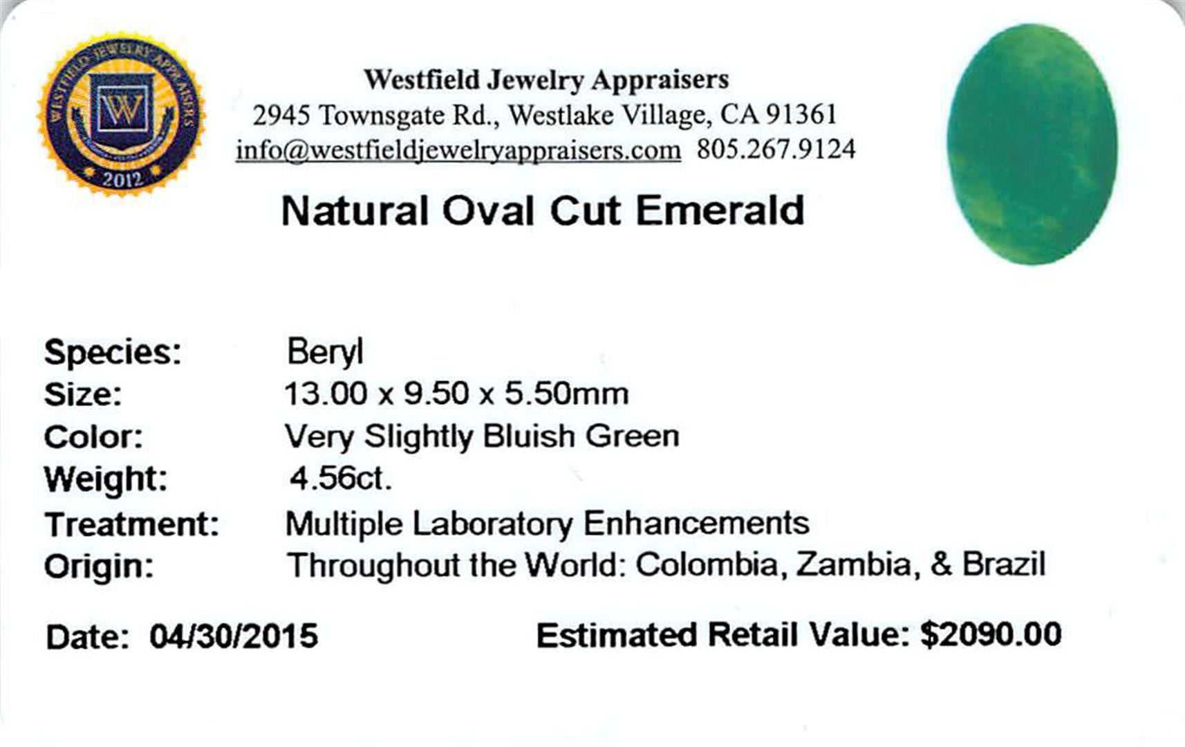One oval mixed cut natural emerald exact weight 4.56ct., clarity is heavily included, type III, medium dark, very slightly grayish, very slightly bluish green color, (GIA vslbG 6/3), cut is good. Westfield Appraised at $2,090.00.